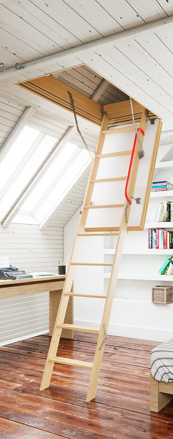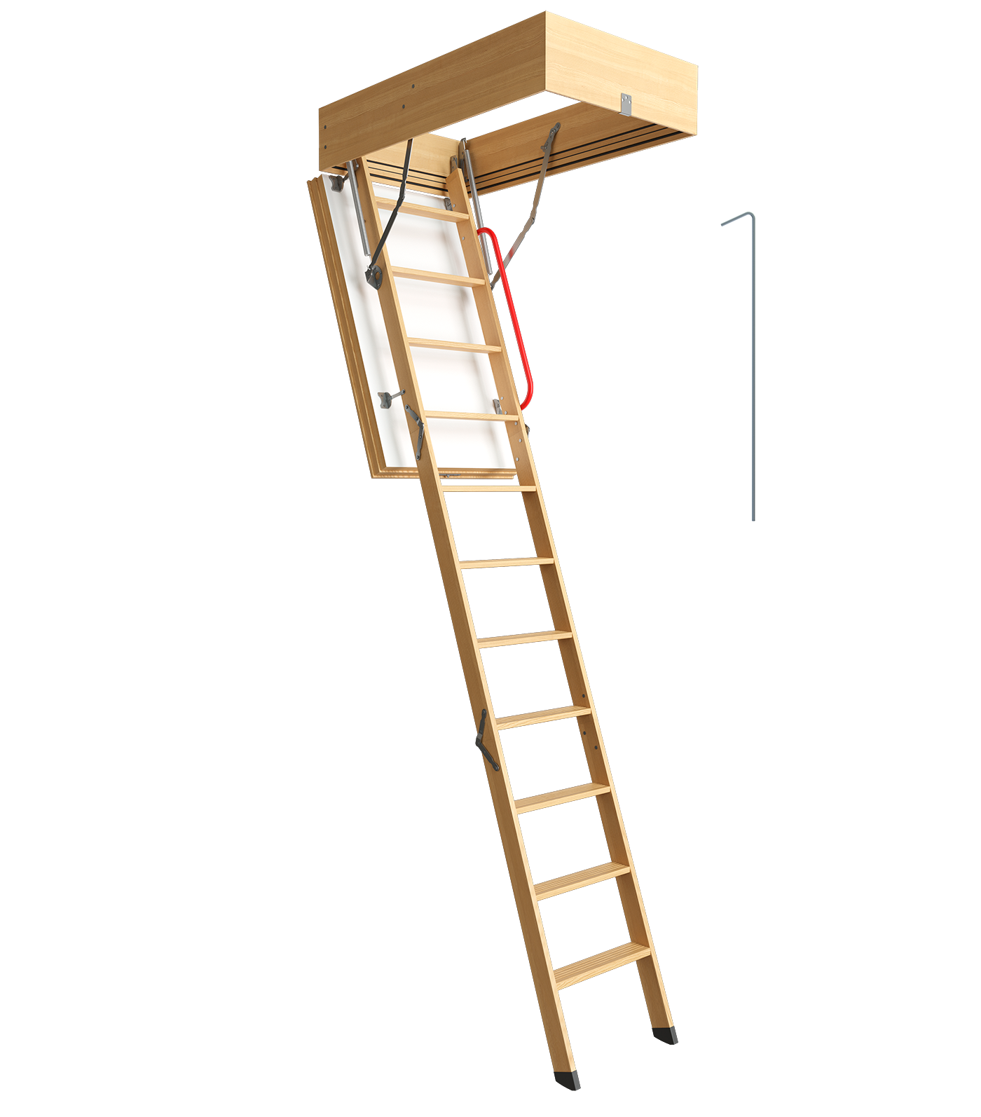Ширина люка увеличена на 100 мм (по сравнению с лестницей STANDARD) для более комфортного подъема. Крепкие ступени из хвойных пород древесины рассчитаны на вес до 170 кг. Вы сможете подняться сами и поднять достаточно тяжелые коробки или вещи на хранение. Конструкция легко раскладывается, когда вам нужно подняться на чердак, и так же легко убирается в потолочный люк.