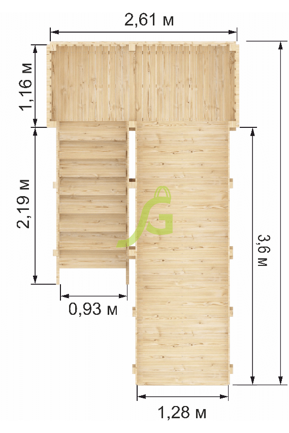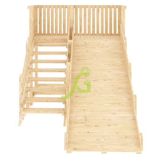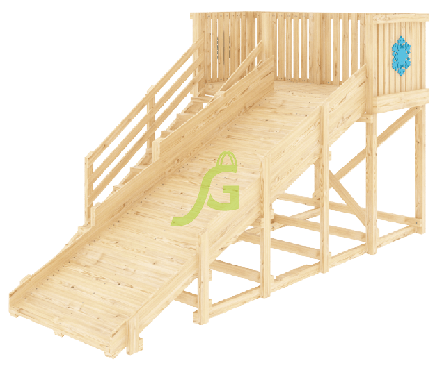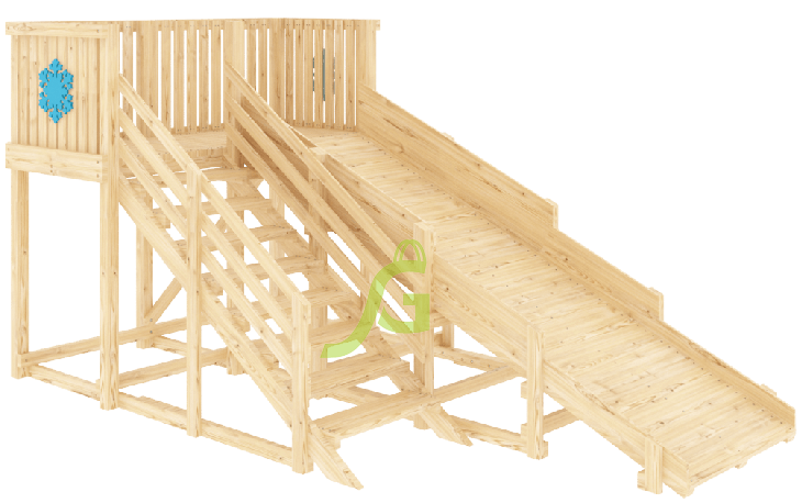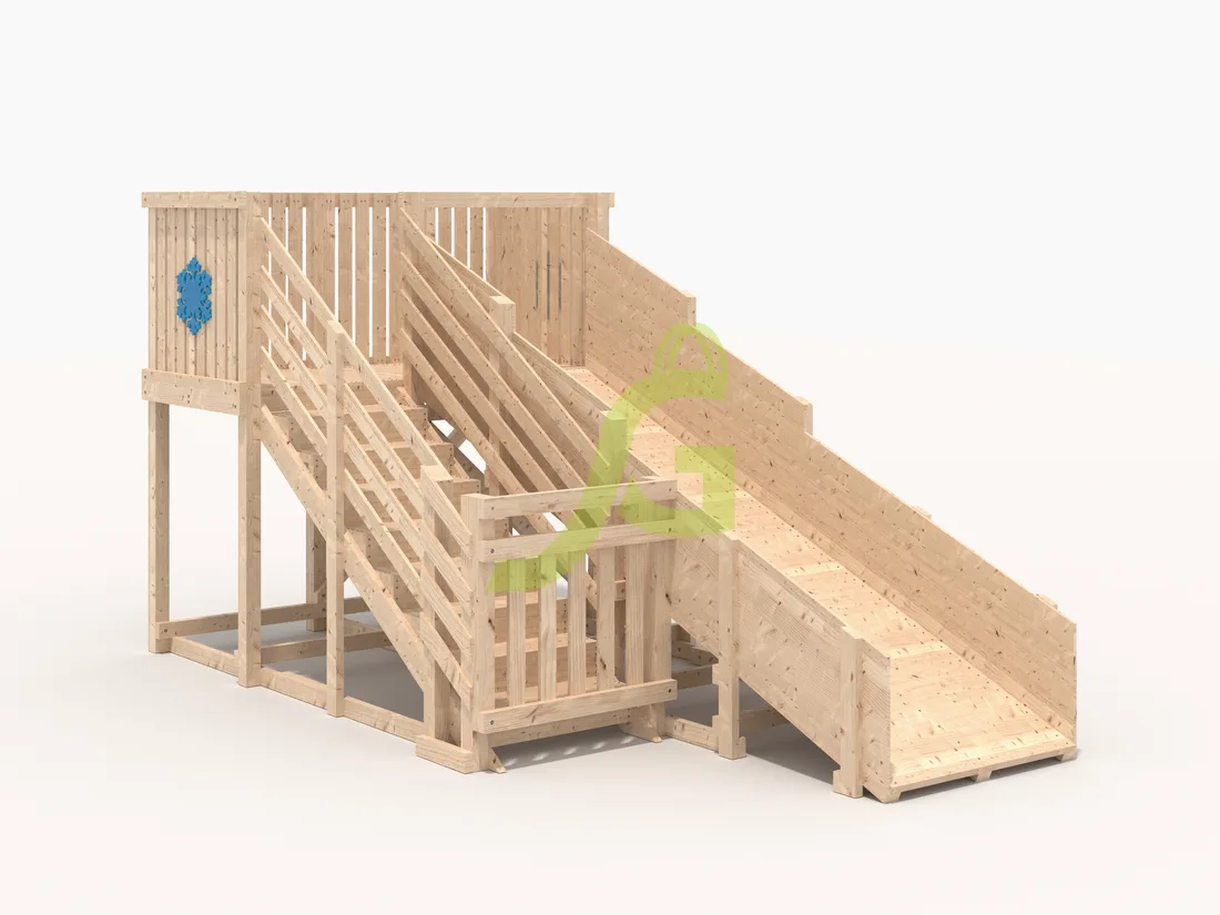 Дополнительные балки делают модуль устойчивым, безопасным и надёжным. Поэтому малыши могут резвиться, катаясь с горки в снежную или морозную погоду. Крепёжные элементы утопают в деревянных элементах, что предотвращает сцепление верхней одежды с саморезами. Родители могут без опаски отпускать детишек отдыхать и тренироваться, потому что они будут находиться в окружении безопасных элементов игровой конструкции.