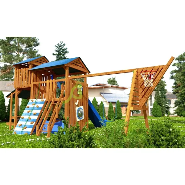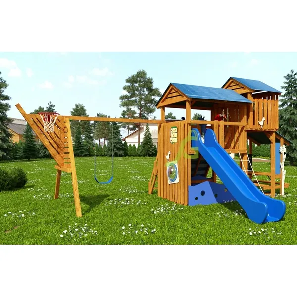 Специализированная для общественных мест детская деревянная площадка полностью оборудовано спортивно-игровыми снарядами: усиленной горкой, гибкими качелями на цепях, скалодромом, доской для рисования, панелью для игры в «Крестики-Нолики».