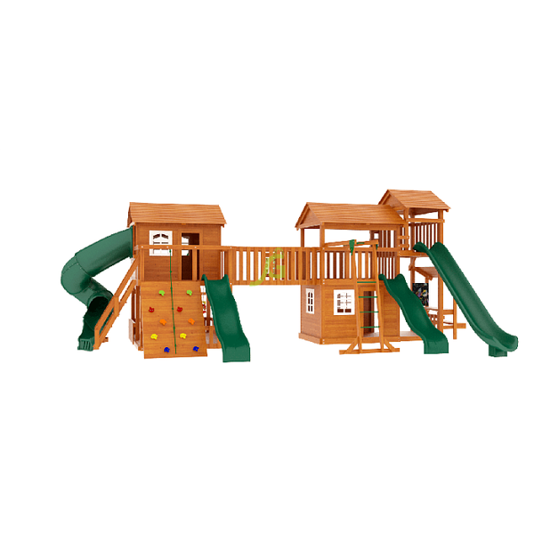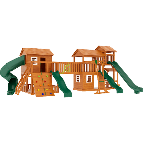 Просто огромный комплекс для детей красиво впишется в ландшафт загородного дома, его стильные башенки с белыми окошками на фоне сочной зелени украсят ваш сад. А самое главное, множество развлечений надолго отвлекут детей от вредных гаджетов, позволят выманить малышей-домоседов на свежий воздух. Разнообразные спортивные снаряды гарантированно будут воздействовать на все группы мышц мальчишек и девчонок. Ведь в площадке есть рукоход, скалодром, канат, лестницы и 4 горки для самых отважных. А для романтичных принцесс и творческих натур предусмотрены разного вида качели, доска для рисования, игра «крести-нолики» и игровой прилавок.