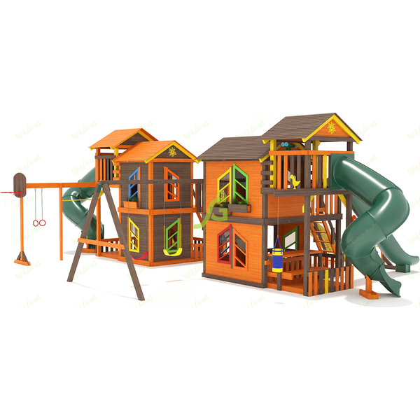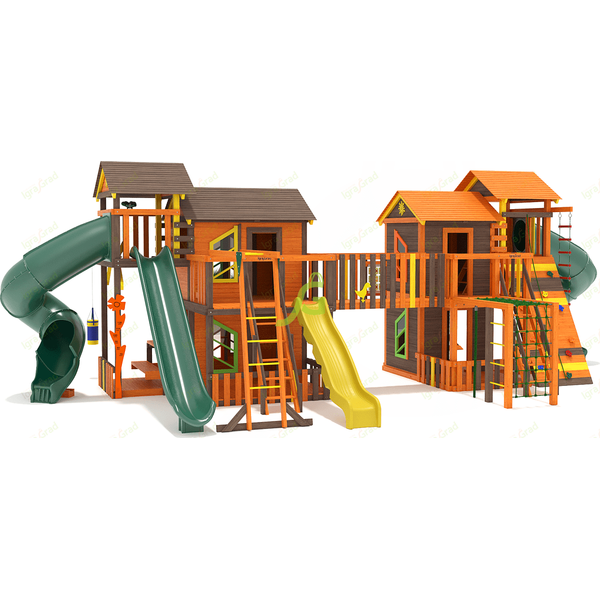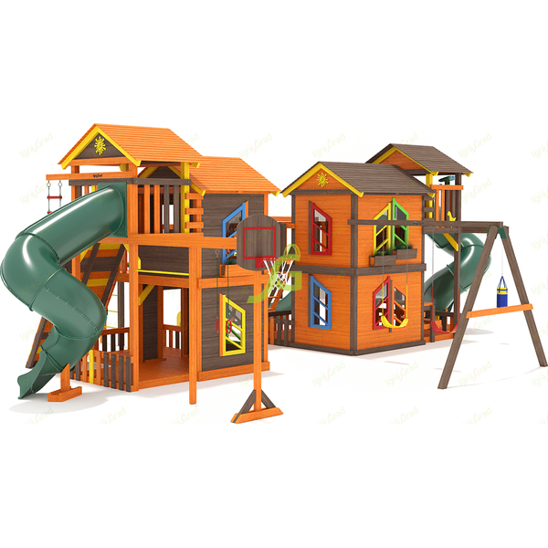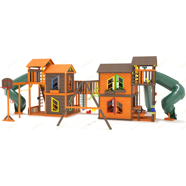 Грандиозный деревянный комплекс укомплектован сразу несколькими игровыми домиками, соединенными между собой переходами-мостиками. Это двухуровневые башни с домиками и верандами, с дизайнерскими окошками и четырьмя горками – волновыми разной длины и горками в виде труб.