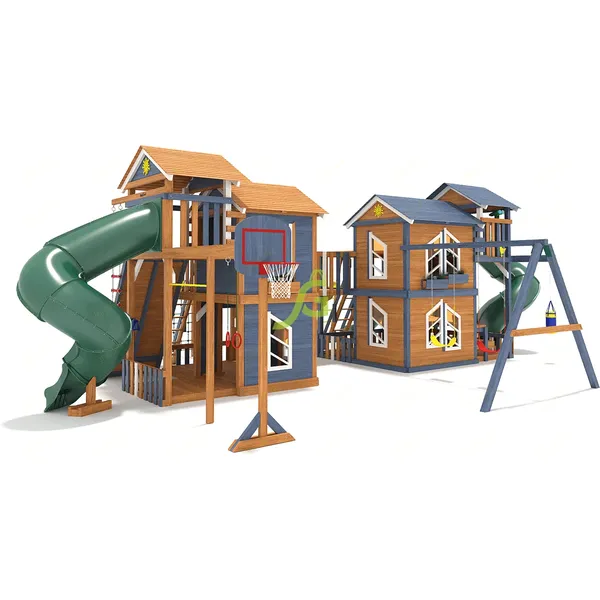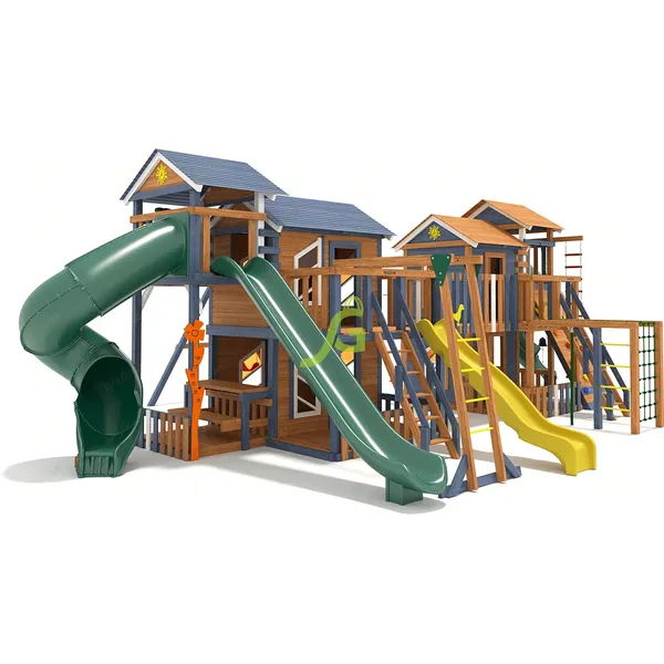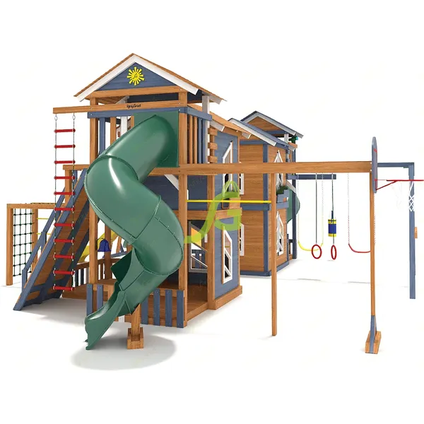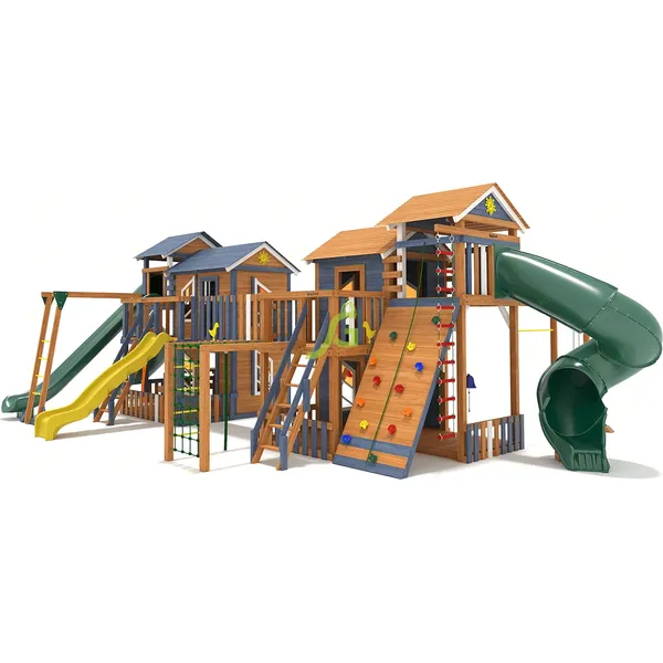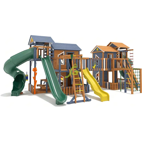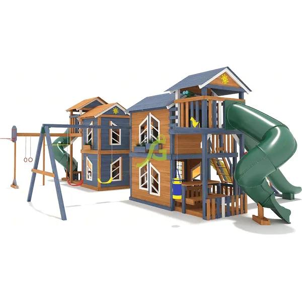 Грандиозный деревянный комплекс укомплектован сразу несколькими игровыми домиками, соединенными между собой переходами-мостиками. Это двухуровневые башни с домиками и верандами, с дизайнерскими окошками и четырьмя горками – волновыми разной длины и горками в виде труб.