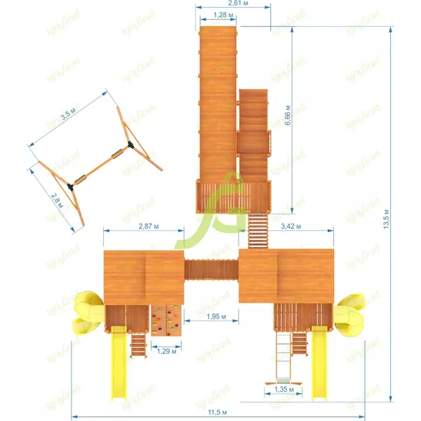 Детская площадка “IgraGrad Великан 3 (Макси) мод.2” включает: – конструкция двухуровневого зашитого снизу домика из клееного бруса 100х100 мм; –