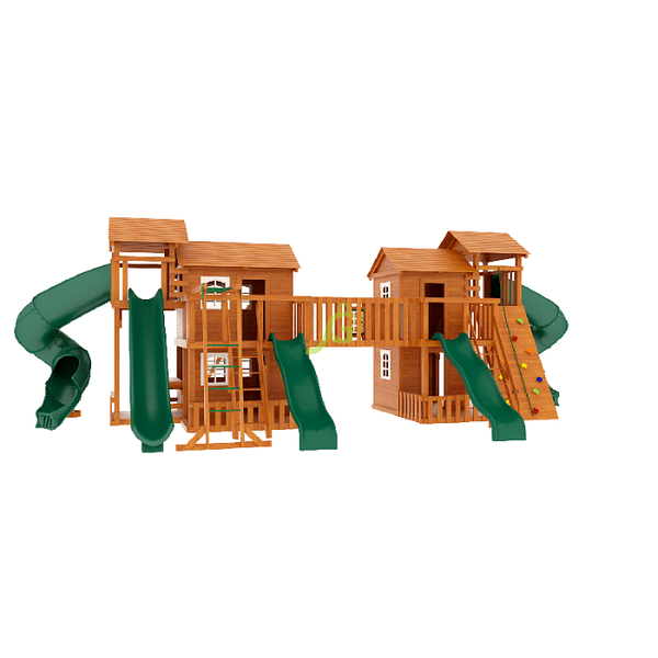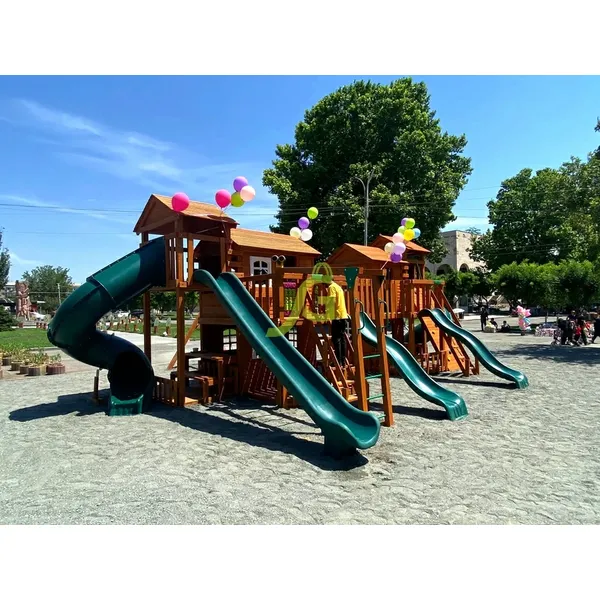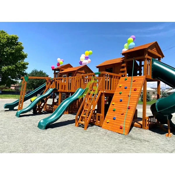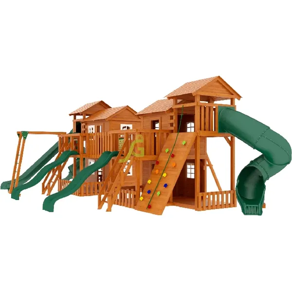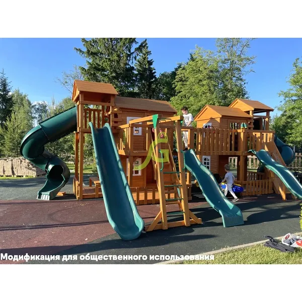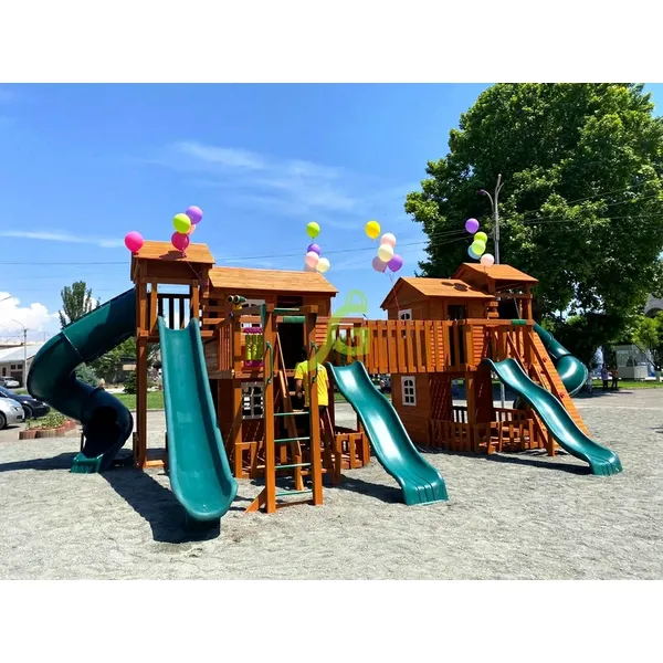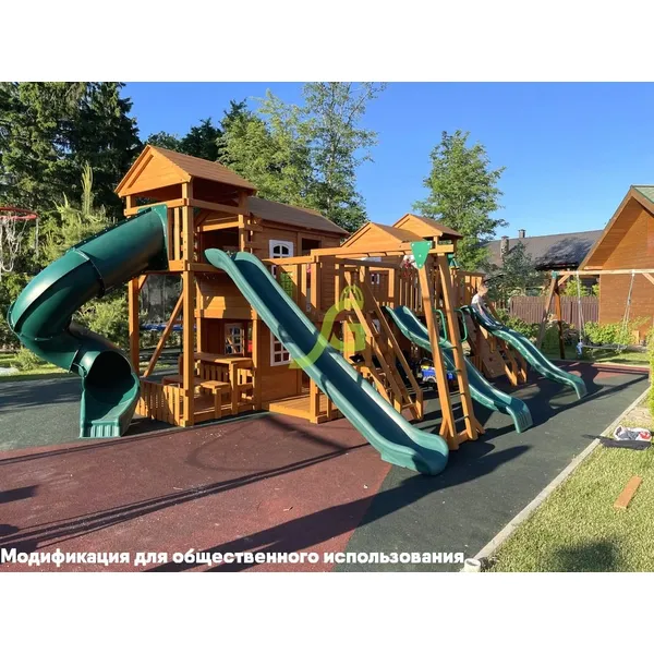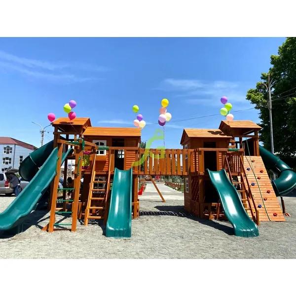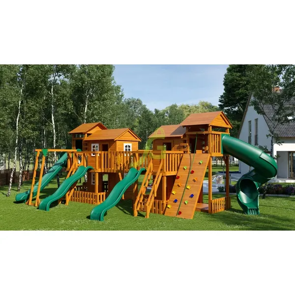 Грандиозный деревянный комплекс Детская площадка «Домик 7» от бренда IgraGrad укомплектована несколькими домиками, соединенными между собой переходами-мостиками. Это двухуровневые башни с домиками и верандами, с пластиковыми окошками, тремя горками – волновыми разной длины и горками в виде трубы.