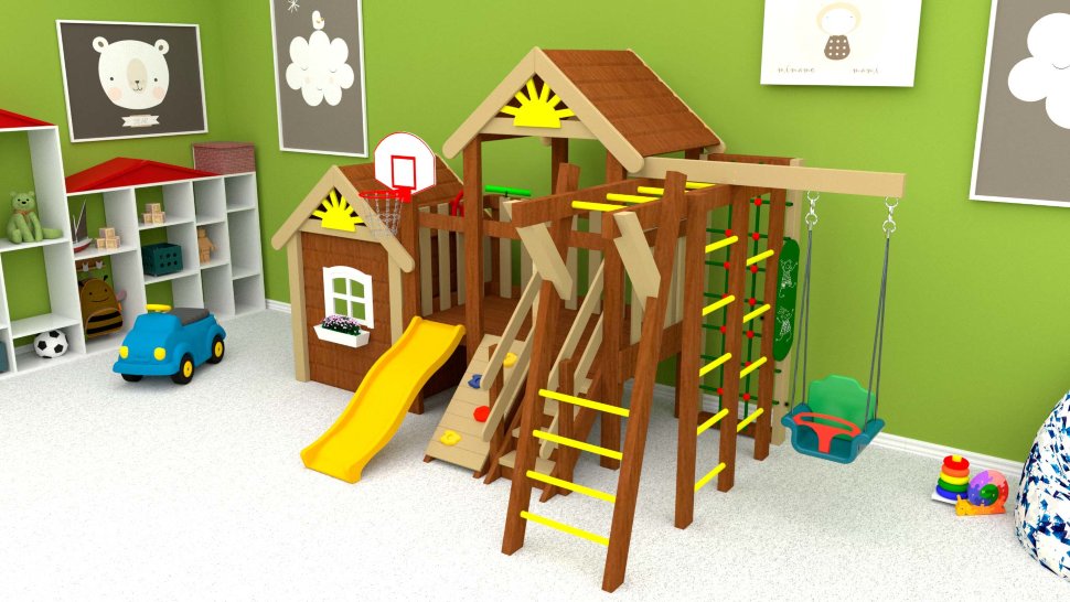 Отличительная черта этого комплекса – компактность. возможность установить его не только на улице, но и в помещении. Даже зимой дети смогут дома кататься на качелях, осваивать скалолазку и весело скатываться вниз с горки.