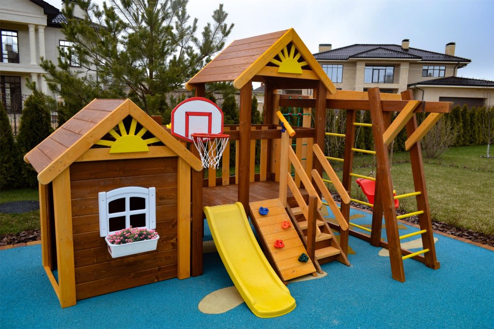 Дизайнеры продумали все детали до мелочей – безопасная устойчивая конструкция, надежные крепления, защитные перила на лестнице и на маршевой площадке, наличие козырька, под которым удобно прятаться в непогоду или от палящего солнца. Еще один важный плюс – это экологичность, комплекс сделан из натурального дерева.
