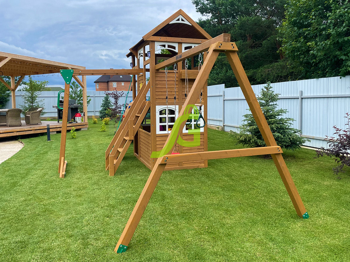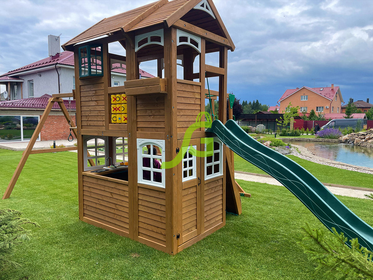 - – Закрытый двухуровневый игровой домик с дверью, деревянной крышей;