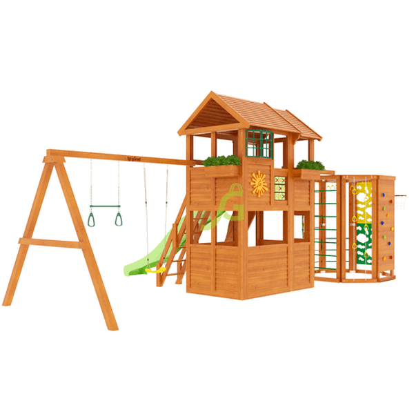 Для шустрых, подвижных деток предусмотрено наличие трапеции с кольцами, верёвочная лестница, стена альпиниста, обезьянья тропа, скалодром с канатом для восхождения, качели, верёвочная лестница, горка. Благодаря играм со штатными элементами и навесным оборудованием ребёнок становится ловким и сильным. Ведь у него начинают полноценно развиваться мышцы, укрепляться суставы, связки, формируется правильная осанка.