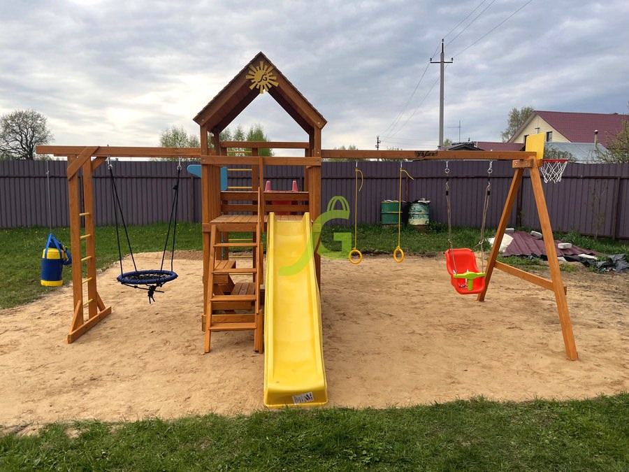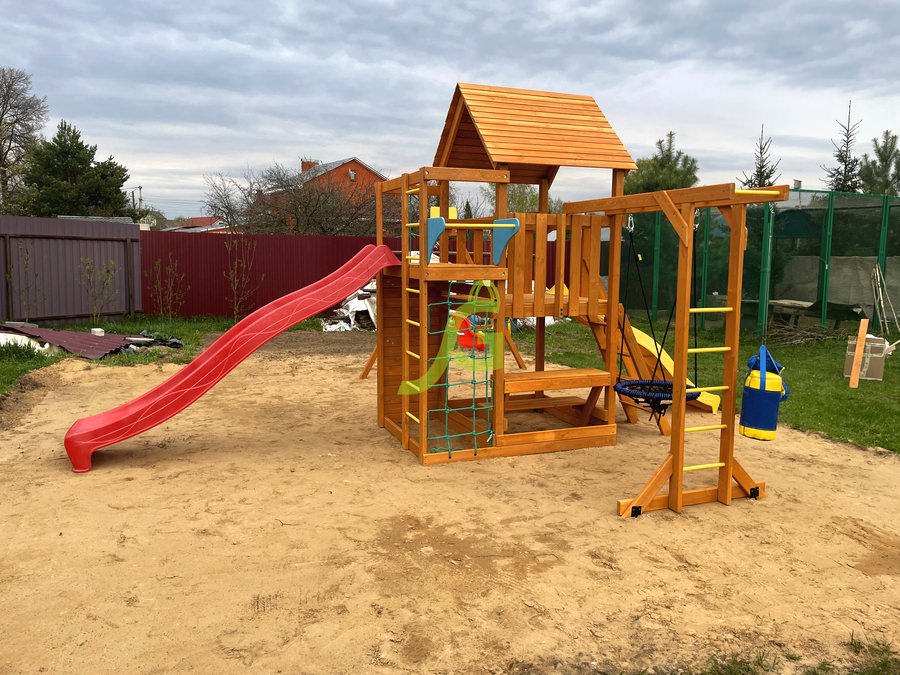 Обращаем Ваше внимание, что цвет установленной детской площадки может отличаться от представленных изображений на сайте. Специфика окраски нетоксичными пропитками допускает отклонения в цветовой гамме отгружаемых изделий вследствие различного цвета натурального природного сырья и естественных компонентов, используемых для производства площадок.