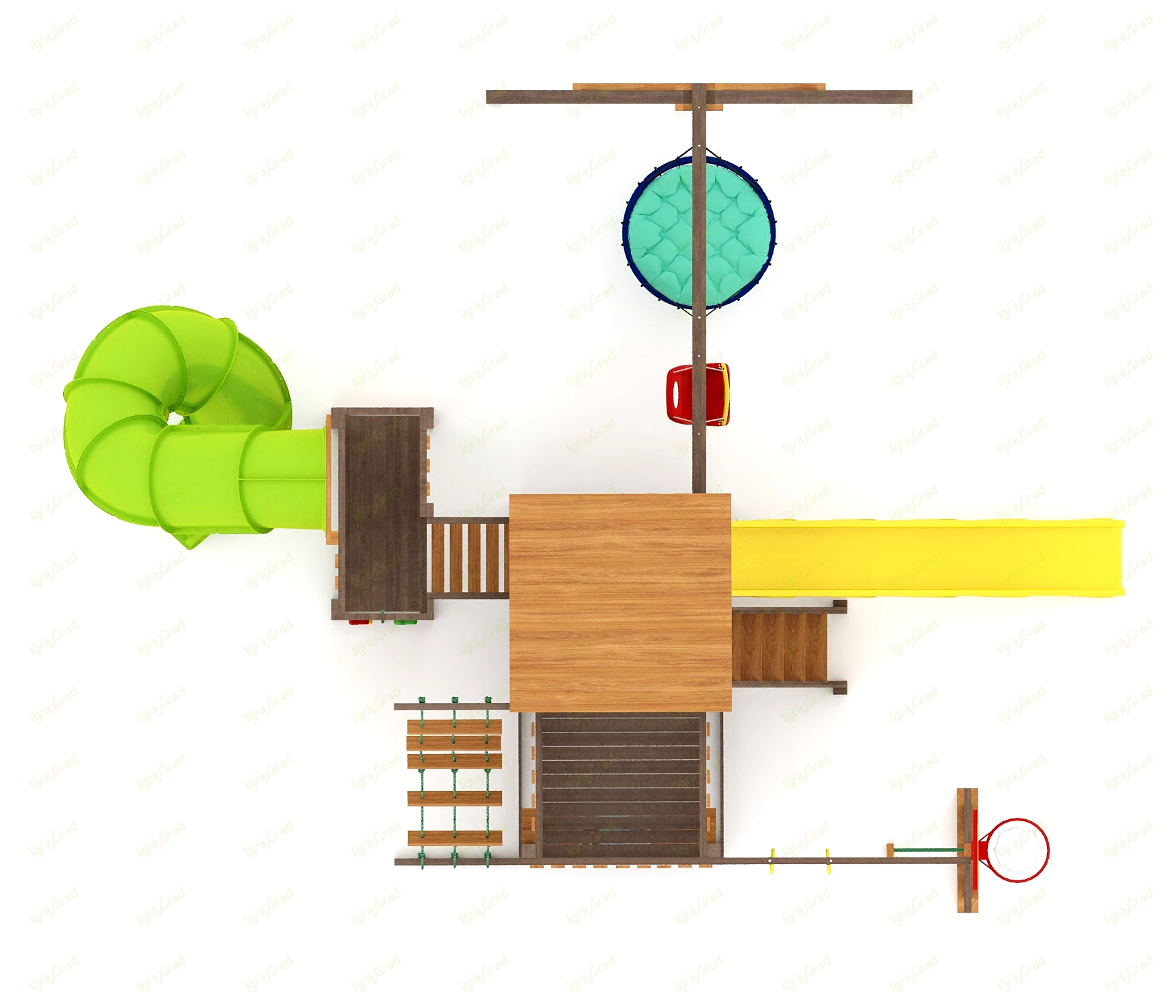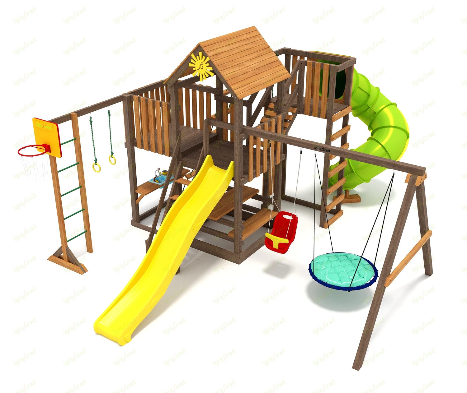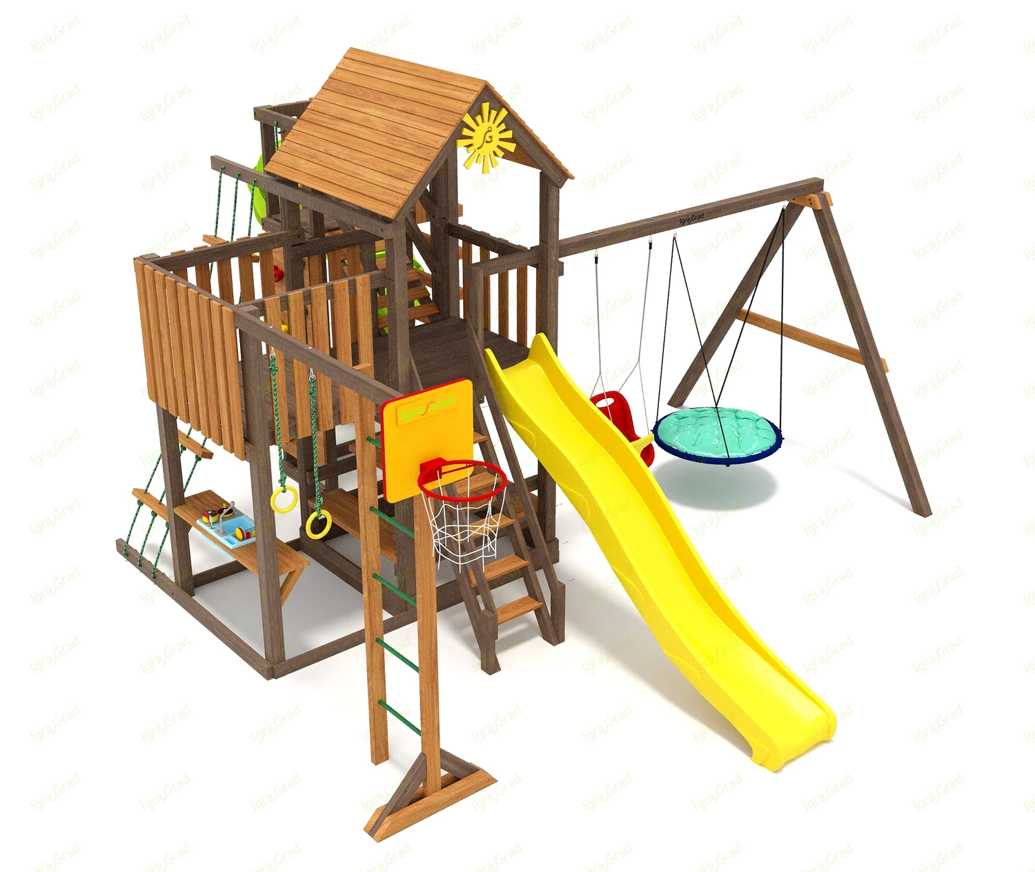 Центр площадки — это двухуровневая башенка с деревянной крышей. В нижней части находится удобная песочница, где можно построить сотню и замков и испечь тысячу и один куличек. На втором уровне находится просторный балкон с площадкой, откуда можно наблюдать за всем. Ребёнок обязательно придумает здесь множество интересных занятий и игр.