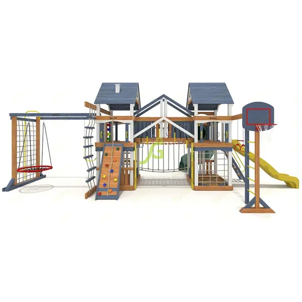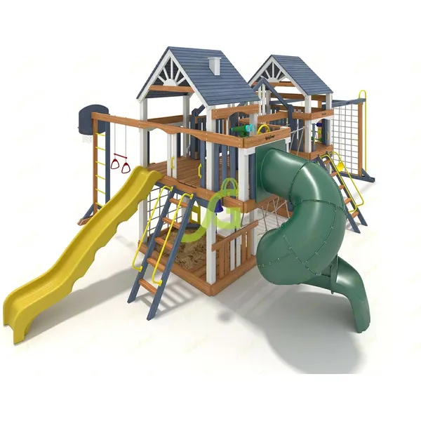 Для весёлого времяпрепровождения предусмотрено наличие волнообразной, винтообразной горок, качелей, панели для игры в «Крестики-нолики», песочницы.