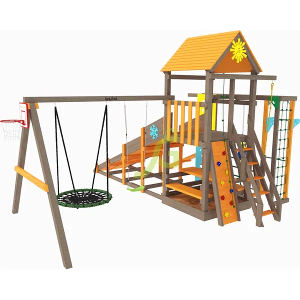 По желанию клиента игровая площадка может быть укомплектована дополнительными элементами. Можно заменить обычные качели на качели-гнездо, которые очень удобны в использовании. Наши специалисты обсудят с вами все детали заказа и быстро оформят заявку.