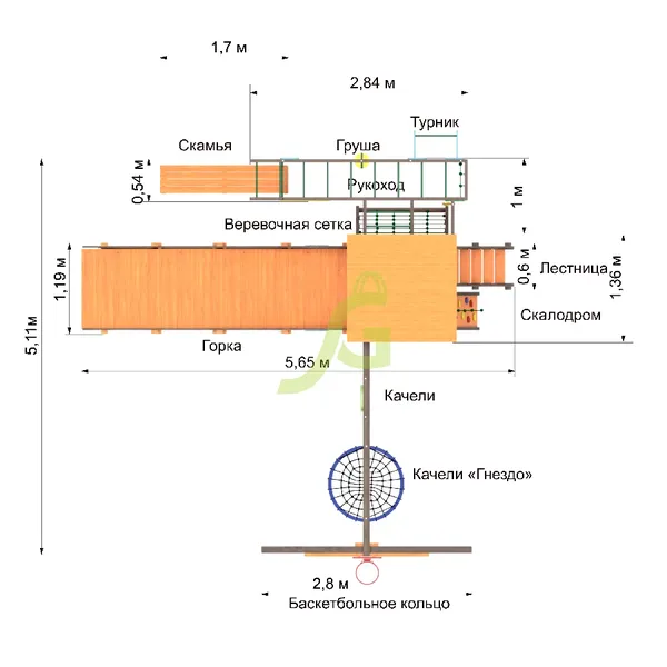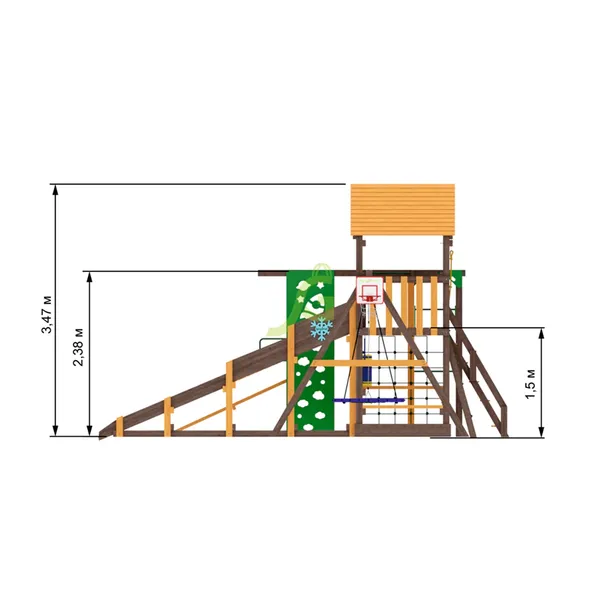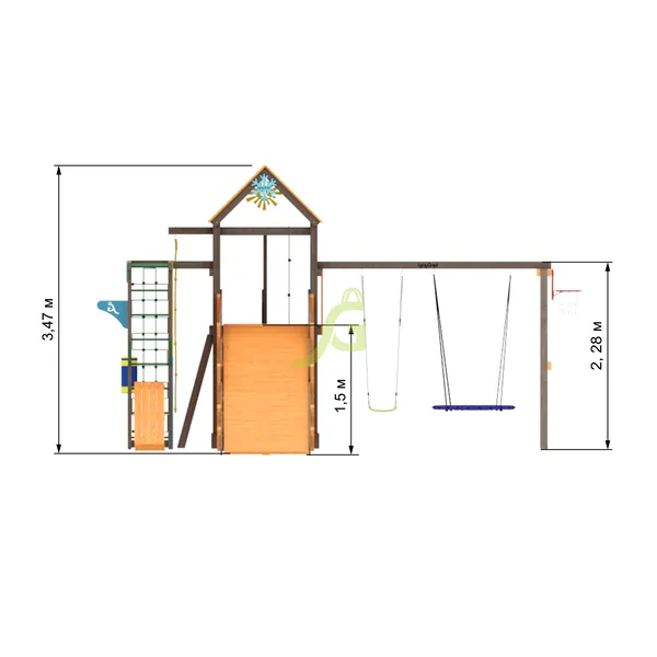Обращаем Ваше внимание, что цвет установленной детской площадки может отличаться от представленных изображений на сайте. Специфика окраски нетоксичными пропитками допускает отклонения в цветовой гамме отгружаемых изделий вследствие различного цвета натурального природного сырья и естественных компонентов, используемых для производства площадок.