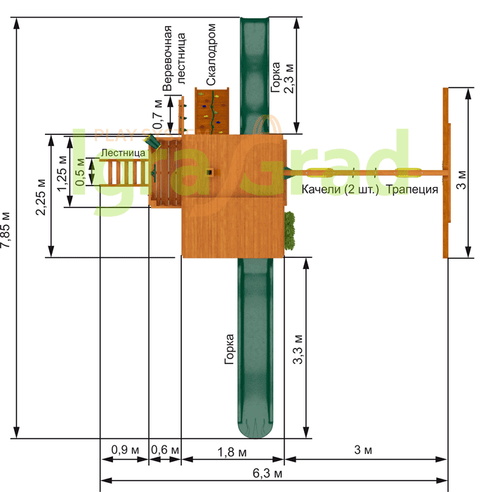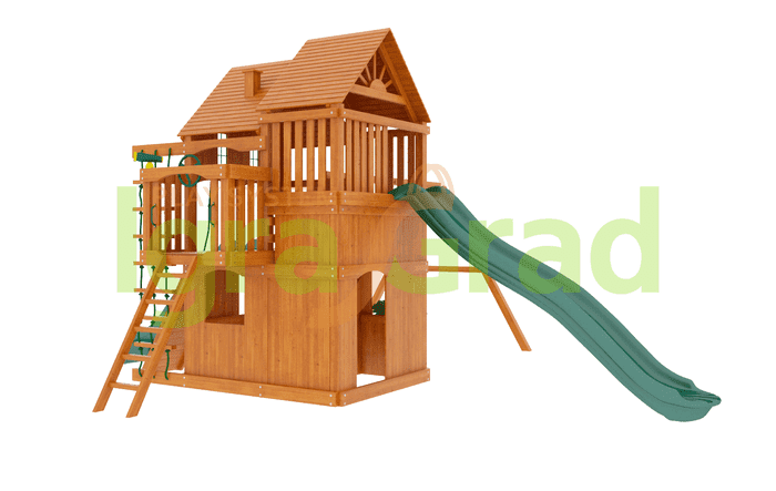 Детская площадка “IgraGrad Великан 2 (Макси) мод.1” включает: – конструкция двухуровневого зашитого снизу домика из клееного бруса 100х100 мм; –
