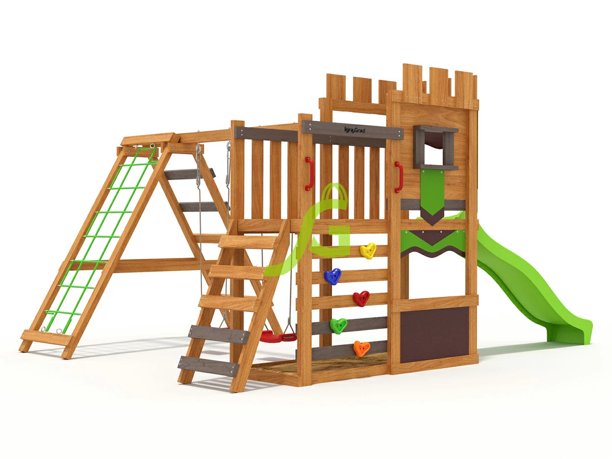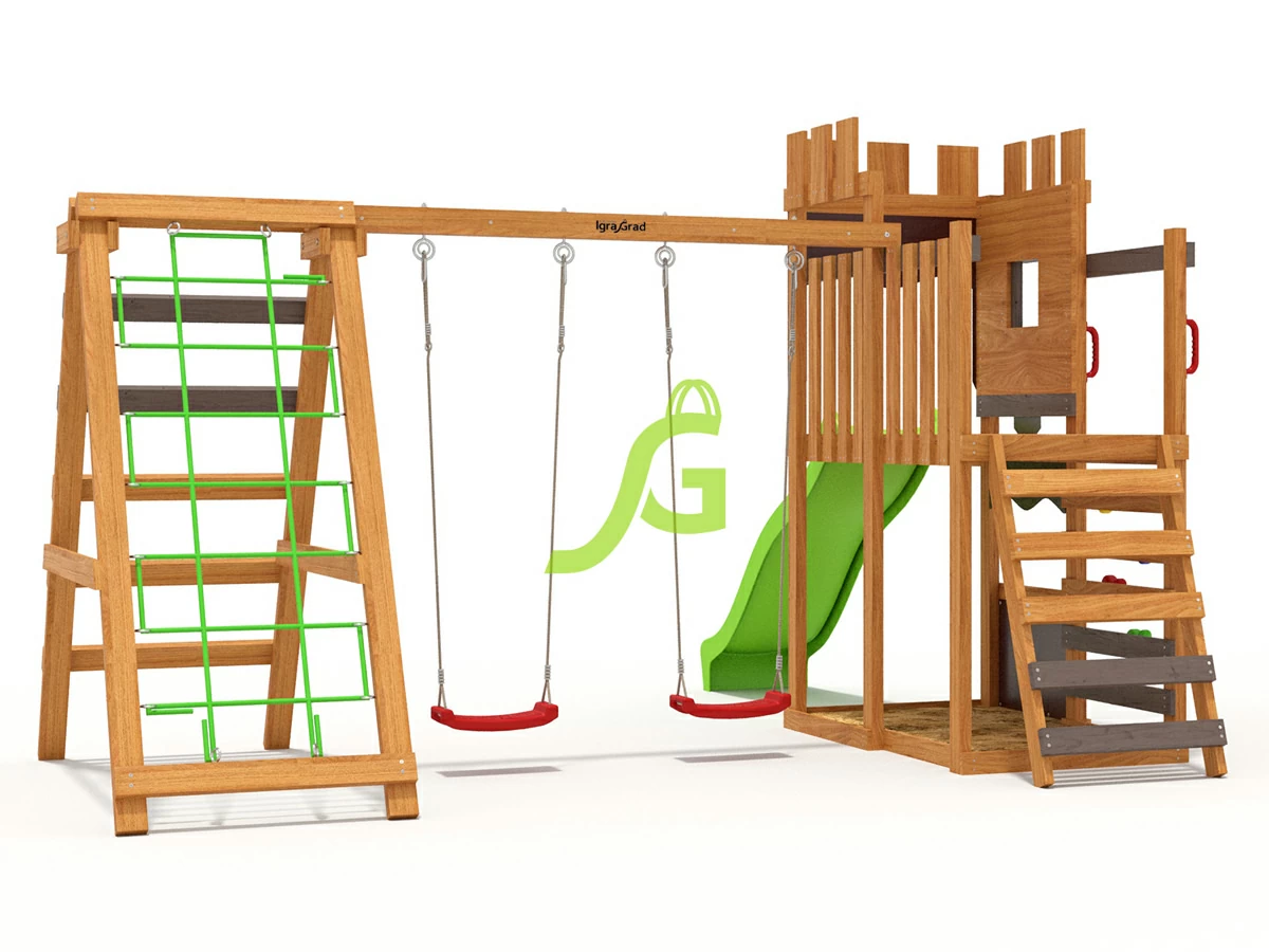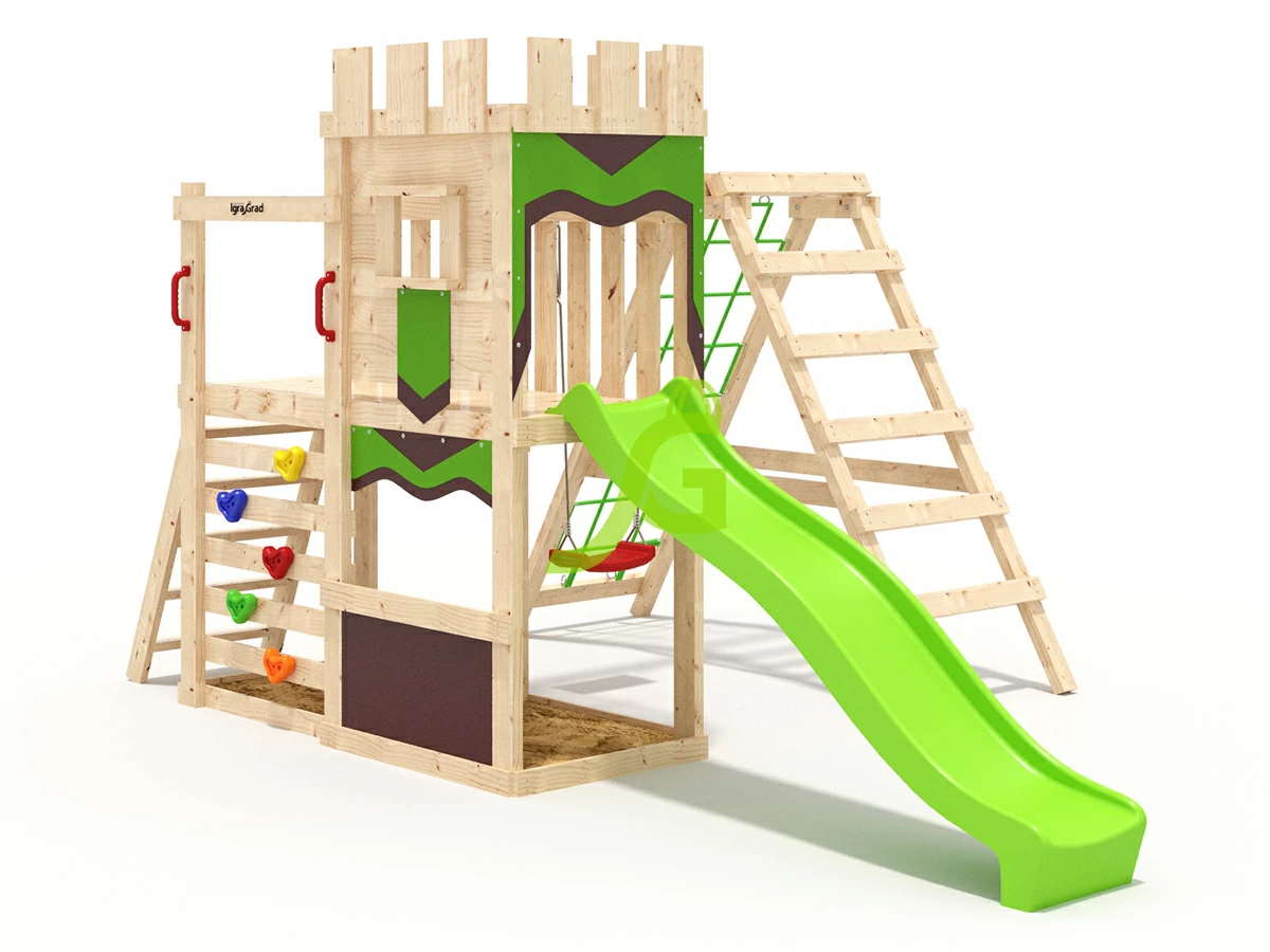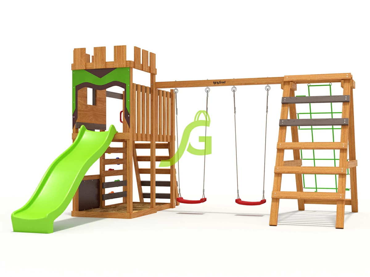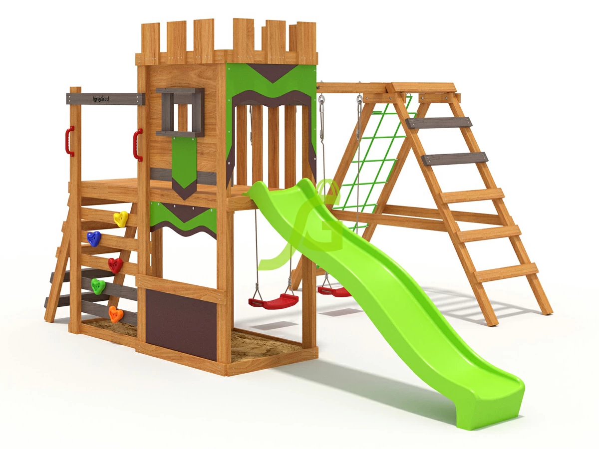 Детская площадка из дерева в виде рыцарской башни с бойницей окном, разработана для детей от 3-х до 11 лет. Она идеально подходит для дачных участков и прекрасно дополнит любой игровой комплекс. Дизайн спортивно-игрового комплекса привлекает детей. Он позволяет придумывать самые разные игры, вообразив себя царевной, запертой в башне. Можно поиграть в сюжетно-ролевую игру «магазин» — для этого имеется специальное окошко с декоративным тентом на первом этаже рядом с песочницей. Несколько качелей, сетка для лазания, скалодром и волновая пластиковая горка позволят поддерживать детям хорошую физическую форму.