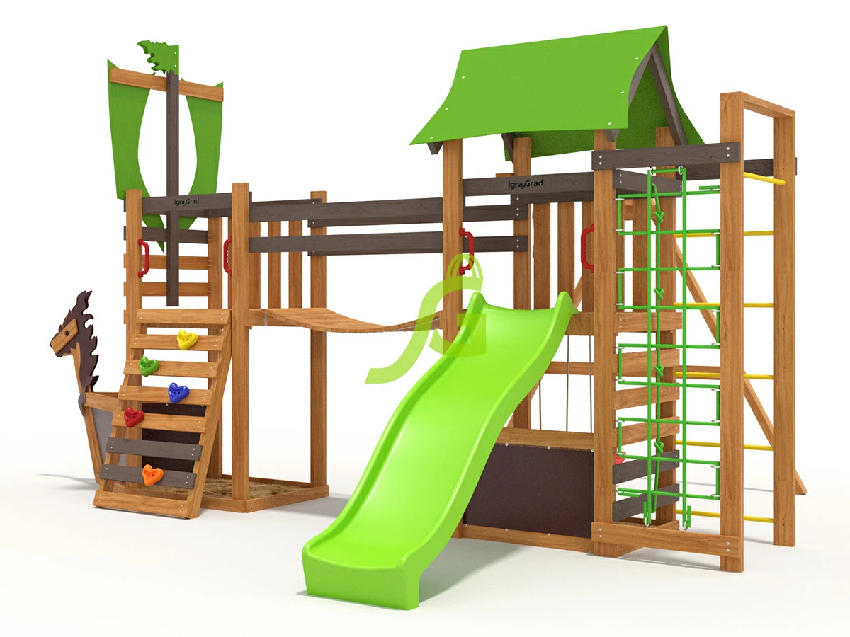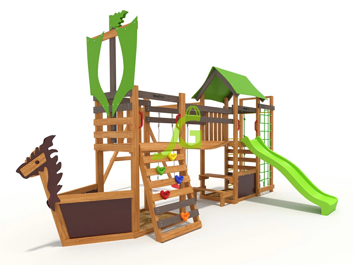 Деревянная детская площадка IgraGrad W20 — настоящее произведение искусства, которое может украсить любой участок! Спортивно-игровой комплекс разработан для детей дошкольного и начального школьного возрастов. Игровая конструкция наделена уникальным дизайном. Больше всего детская площадка похожа на корабль викингов — эту особенность можно взять за основу в сюжетно-ролевых играх. Это не только большой игровой домик в форме старинного корабля, но и двойные качели, песочница, скалодром, турник, сетка и канат для лазания. Горка со скатом с высоты 2 метра. Две игровые платформы украшены мотивами мореплавания.