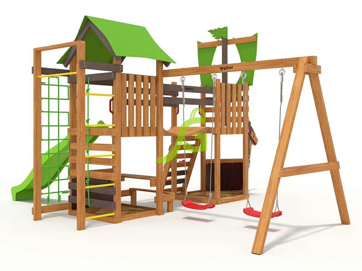 При производстве детской площадки IgraGrad W20 используется древесина высшего качества. В качестве опор применяется брус камерной сушки размером 45х90 мм. Игровой комплекс имеет необходимые отверстия основных узловых элементов, что очень сильно упрощает работу по его сборке.