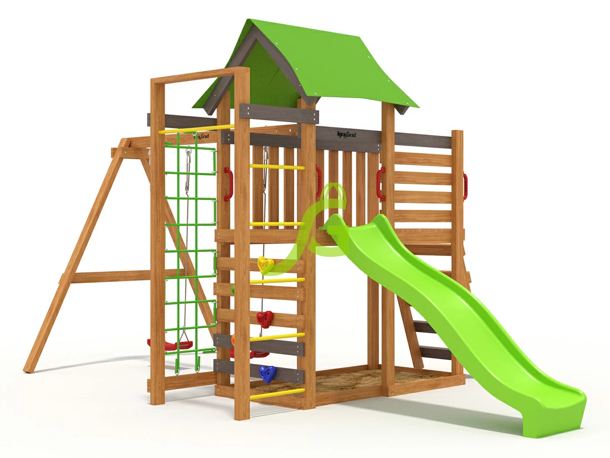 Спортивно-игровое сооружение изготовлено из качественного материала — бруса камерной сушки, прочного пластика и металлических крепежей. Брус для основания площадки имеет размеры 45х90 мм. Игровой комплекс имеет необходимые отверстия основных узловых элементов, что очень сильно упрощает его сборку. Острые края деревянных деталей — скруглены, что делает использование городка безопасным. Крыша и декоративные вставки детской площадки выполнена из влагостойкой армированной тентовой ткани ПВХ — любые негативные воздействия ей не страшны!