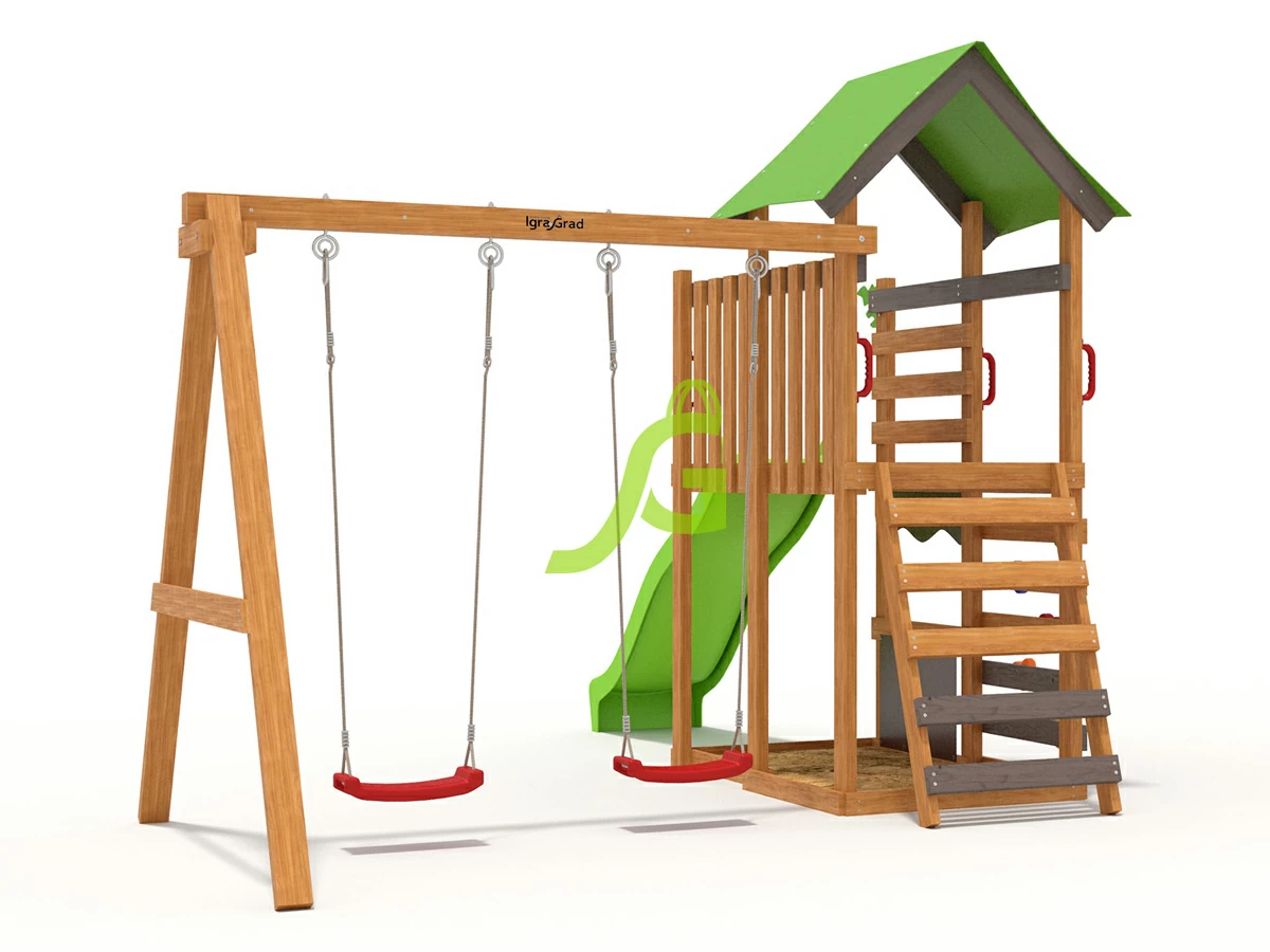 Игровая башня с горкой – идеальное универсальное средство для бесконечного веселья в Вашем саду. Igragrad ( ИграГрад) серии w с прочной ПВХ крышей дает Вашим детям возможность создать игровую зону. Благодаря встроенной песочнице Ваши дети смогут раскрыть свой творческий потенциал и превратить ее в пекарню для песочных фигур со своими друзьями. На платформу, защищенную прочной ПВХ крышей, можно попасть по двум лестницам. Встроенное подключение к воде в нашей волновой пластиковой горке обеспечивает дополнительный элемент экстрима. Наши высококачественные аксессуары и двойные качели подарят новые захватывающие игры Вашим детям. В комплексе также имеется скалодром для лазания на башню.
