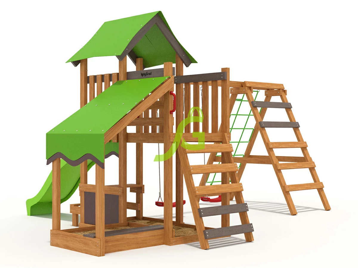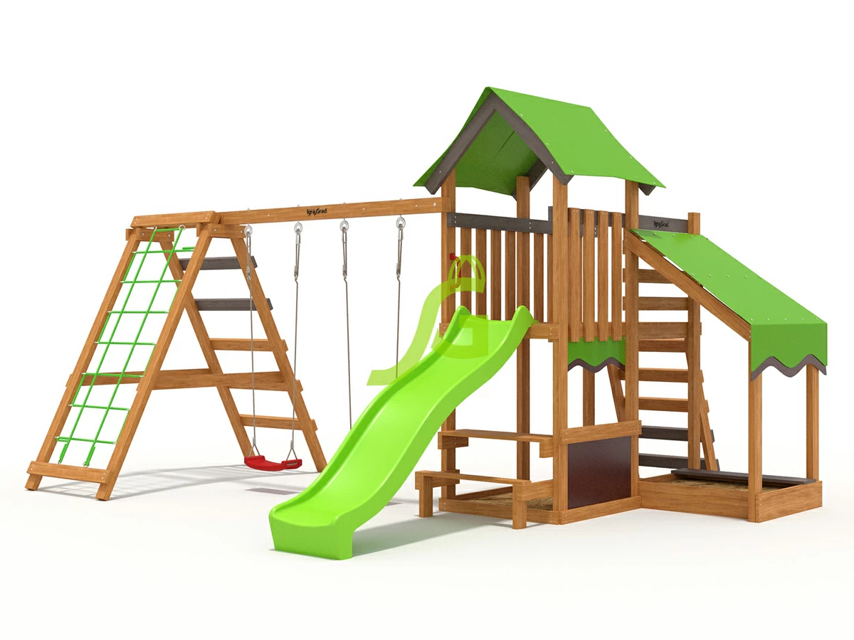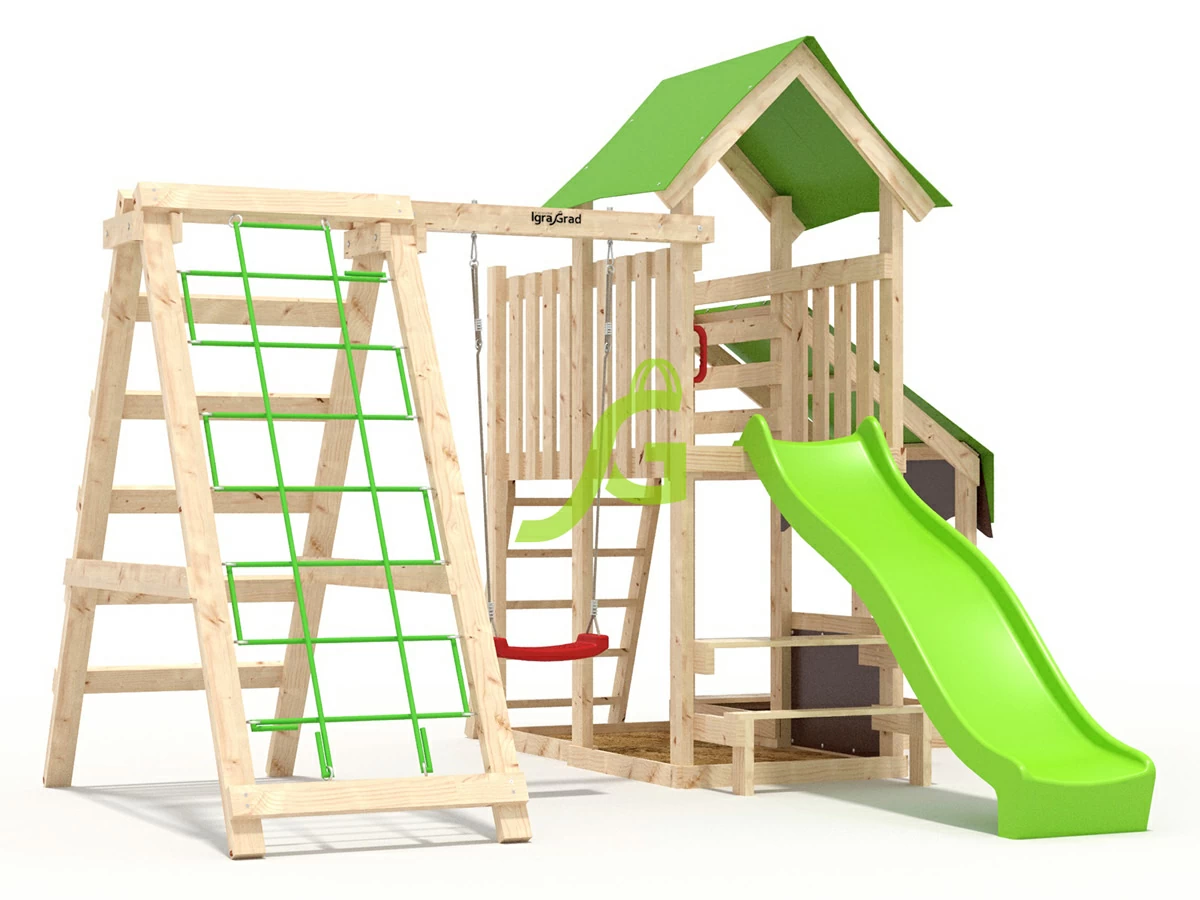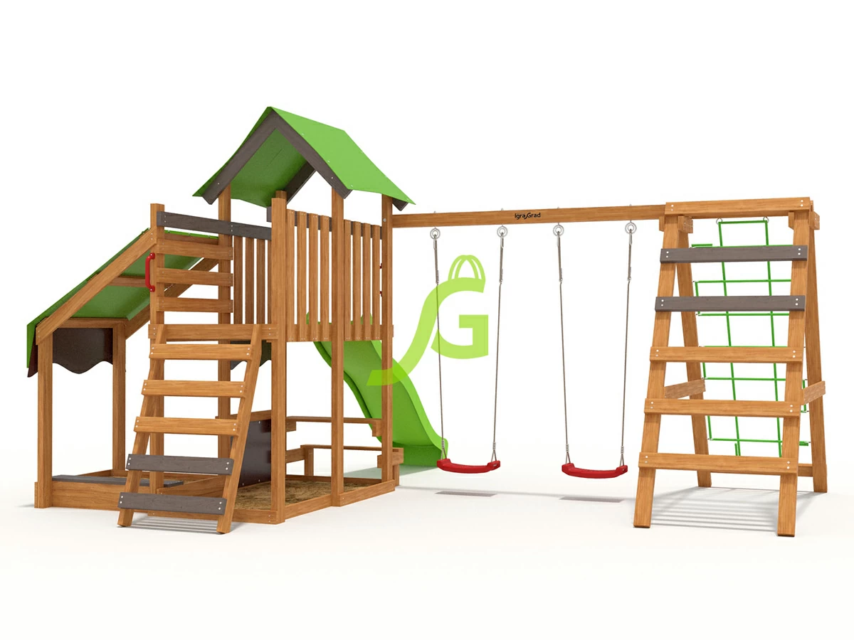 Деревянная детская площадка IgraGrad W9 — красивое и функциональное решение для создания безопасной и познавательной среды для физического, коммуникативного развития детворы. Увеличенная игровая башня расширяет пространство для игр наверху. Две цепные качели, сетка для лазания и волновая пластиковая горка с подключаемой водой – добавят экстрима. Большая песочница с лавочкой и столиком для пикника понравится детям помладше, а так же их родителям. Вы можете укомплектовать игровой комплекс спортивными и игровыми аксессуарами на выбор, согласно предпочтениям Вашего ребенка.