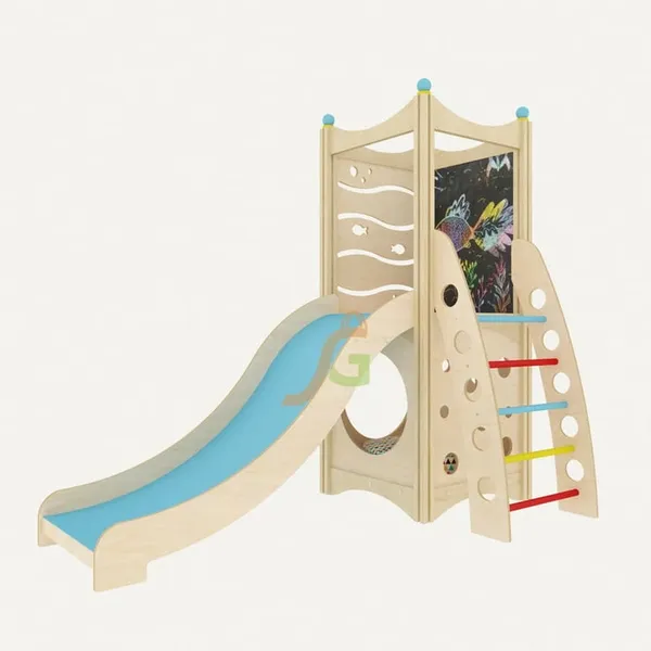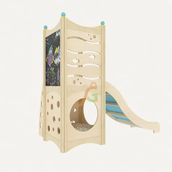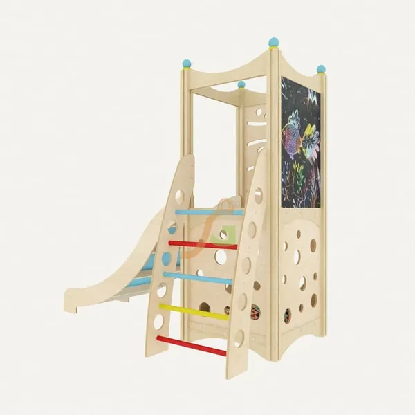 Каждый элемент наделён красочным оформлением, чтобы дети в процессе игры могли изучать основные цвета. Внутри домика малыши могут комфортно расположиться вместе с игрушками. Конструкция направлена не только на развитие физических способностей детей, но и совершенствование творческих данных: предусмотрено наличие грифельной доски. Выделяются и другие преимущества игрового домика: