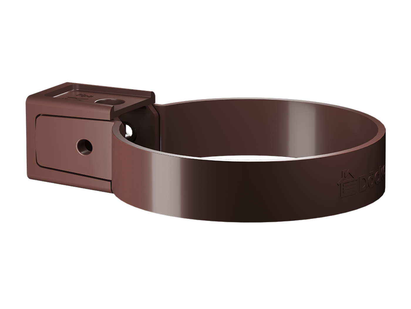 Хомут, окрашенный в цвет «Шоколад», необходим для крепления к фасаду здания труб, колен, соединительных муфт и наконечников такого же цвета.