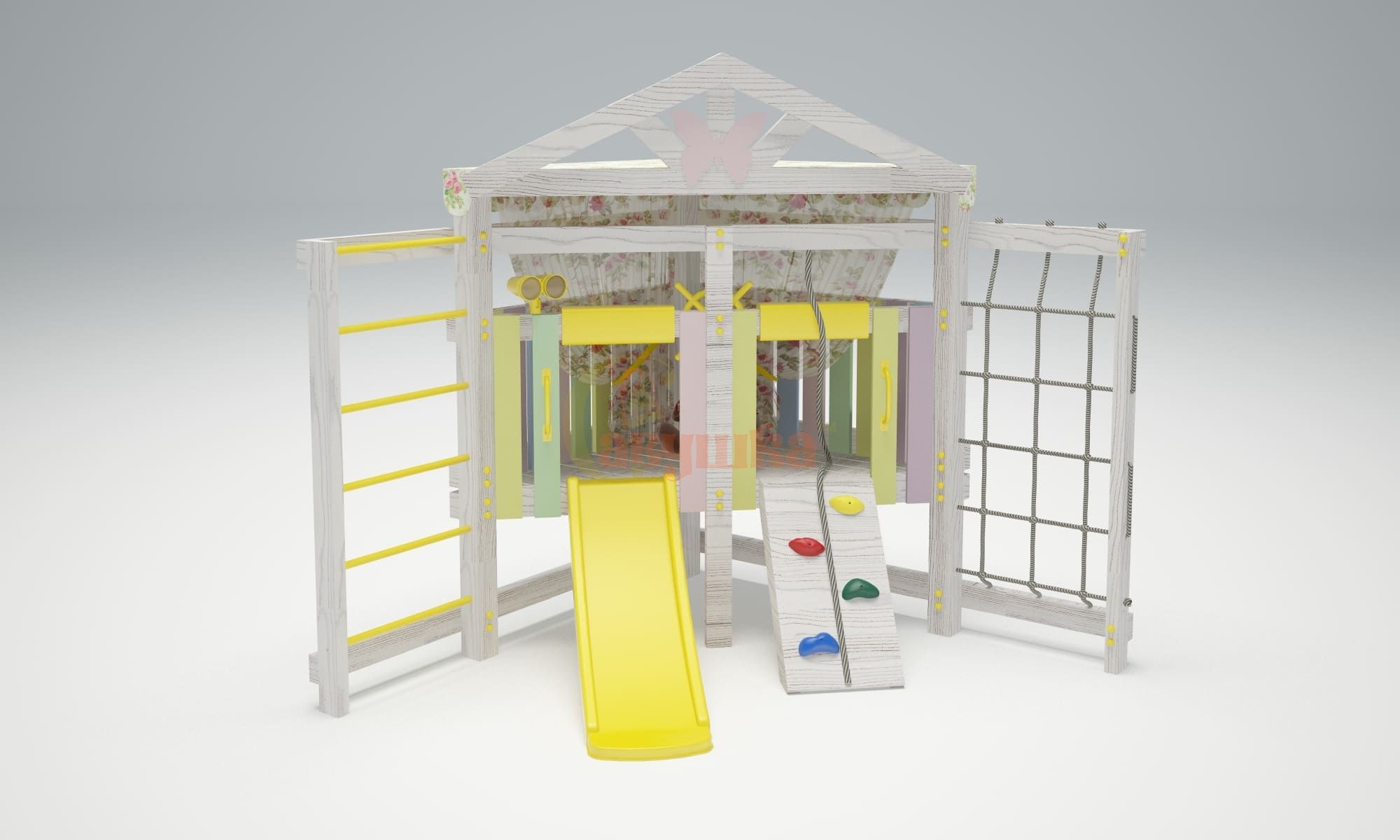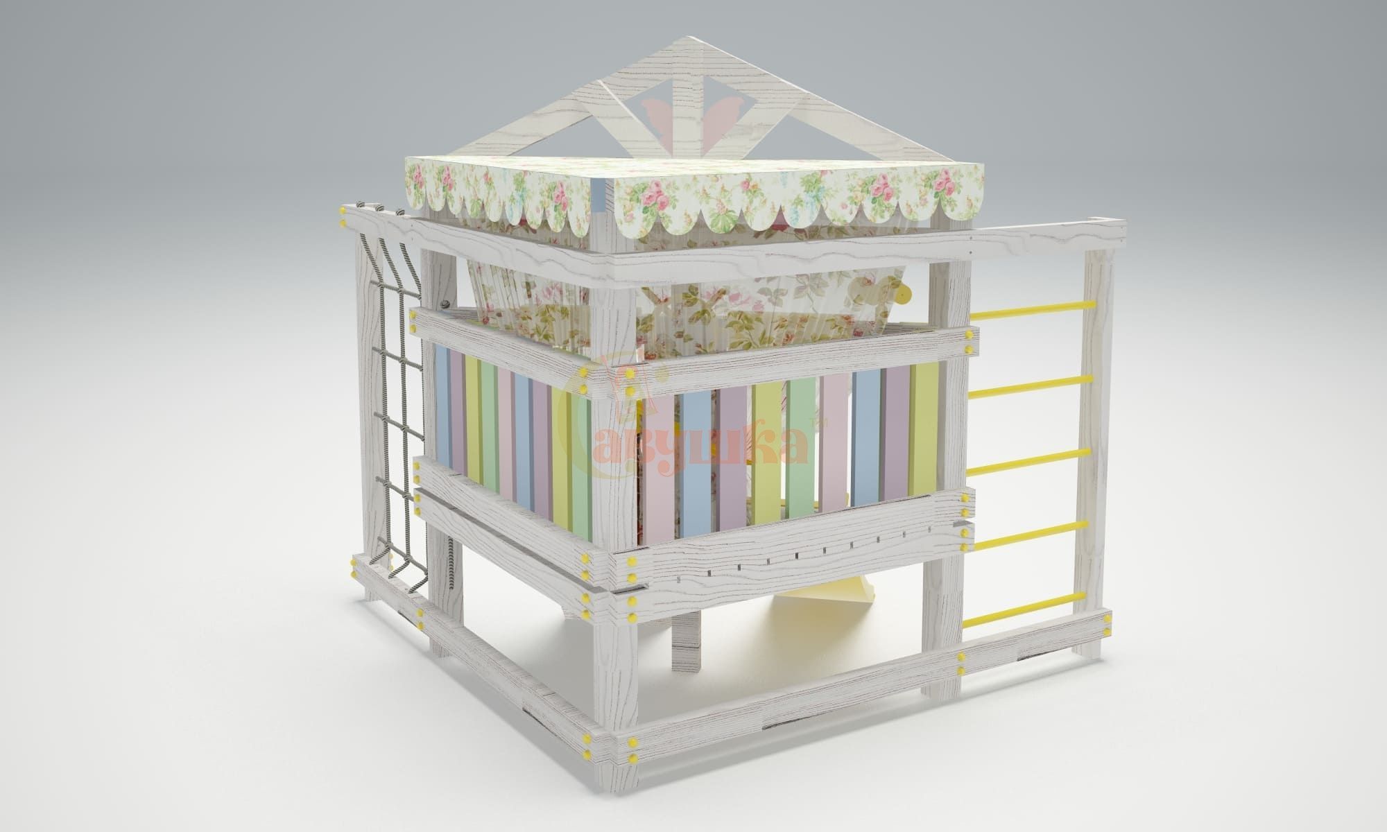 Для долговечности и защиты от внешних воздействий деревянные элементы покрыты лакокрасочными средствами на водной основе. Эти составы полностью безопасны, не выделяют вредных веществ и сохраняют насыщенный цвет на долгие годы.