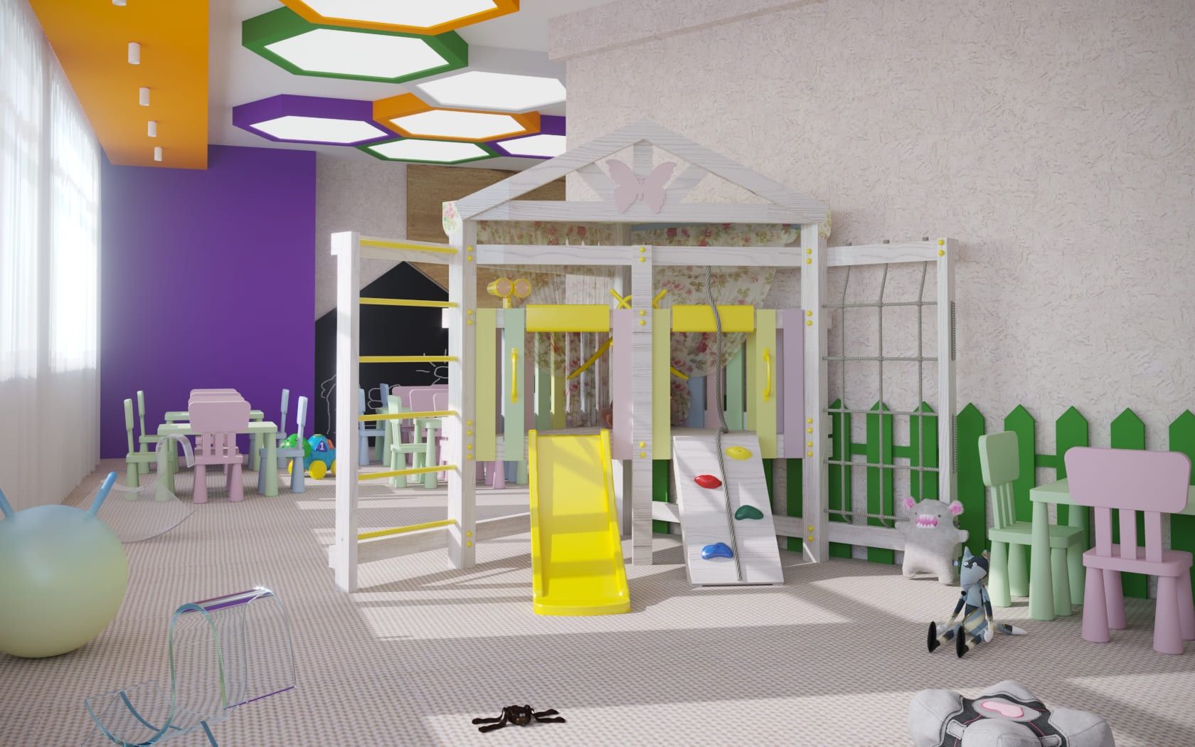 Спортивная зона включает шведскую стенку и канатную сетку, на которых дети могут тренировать мышцы, развивать гибкость и выносливость.
