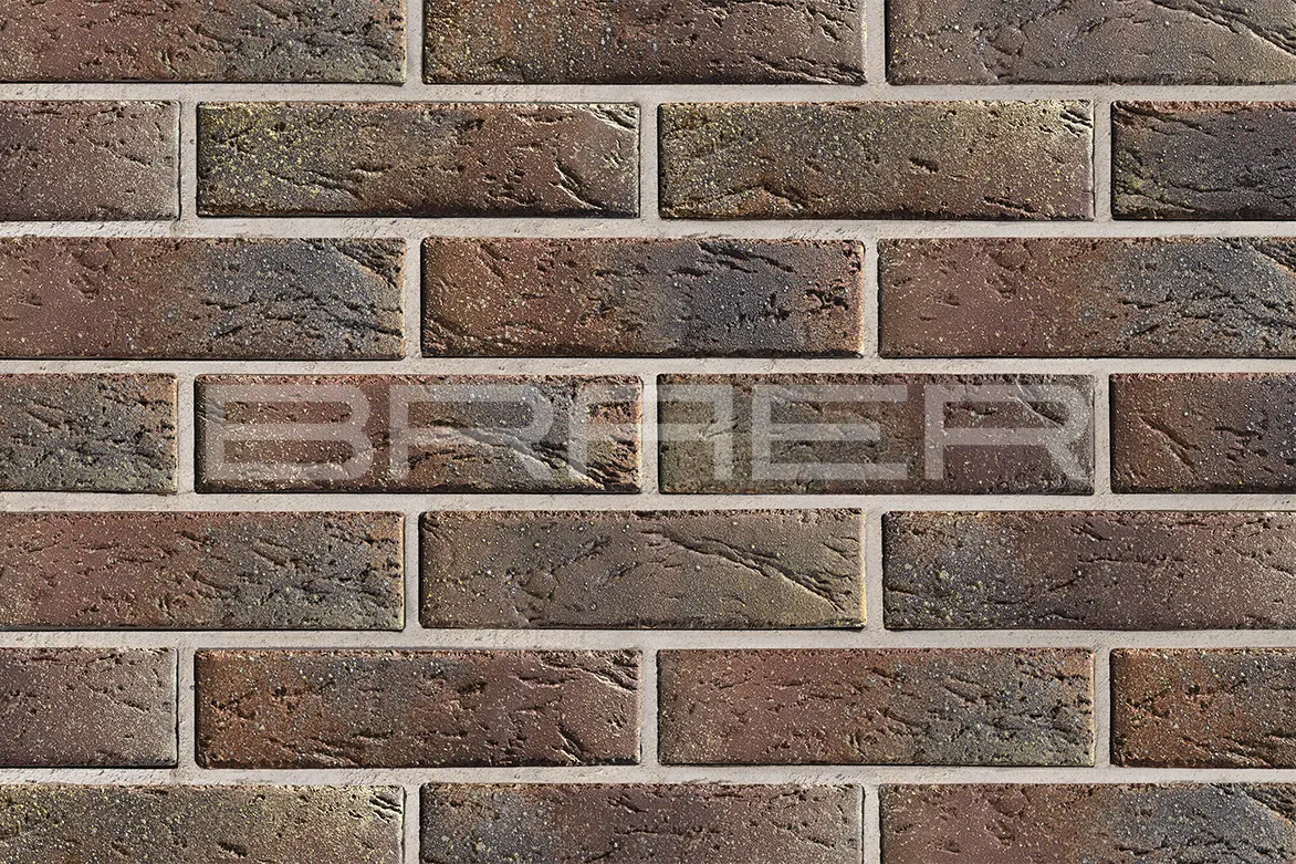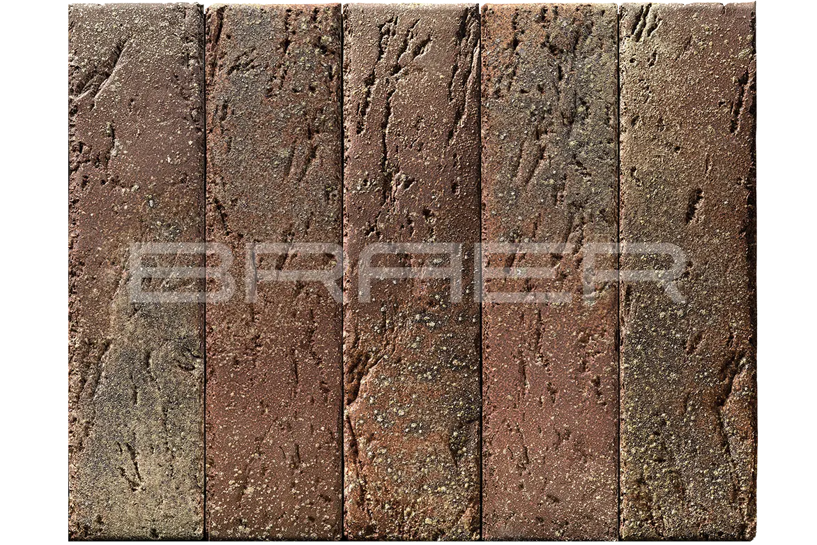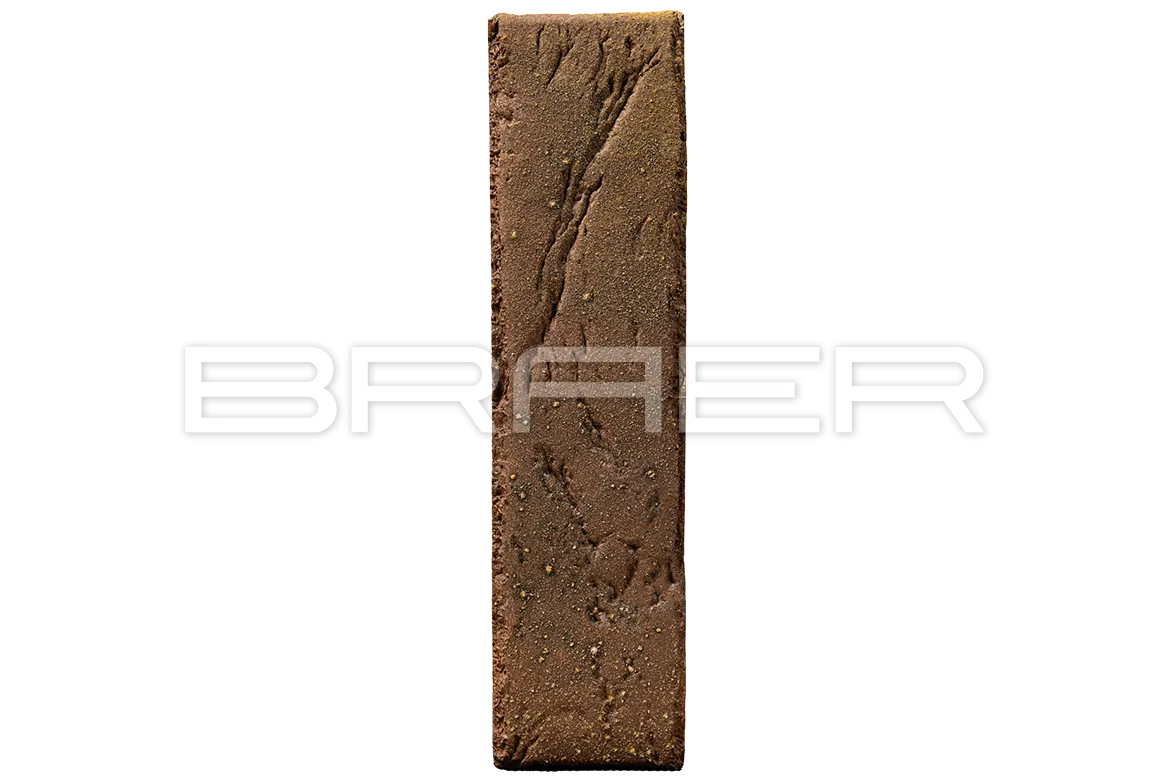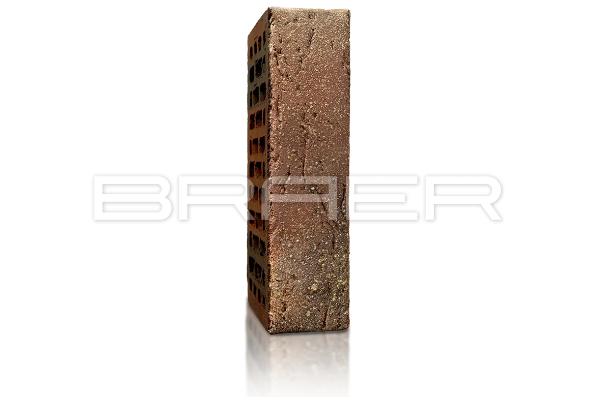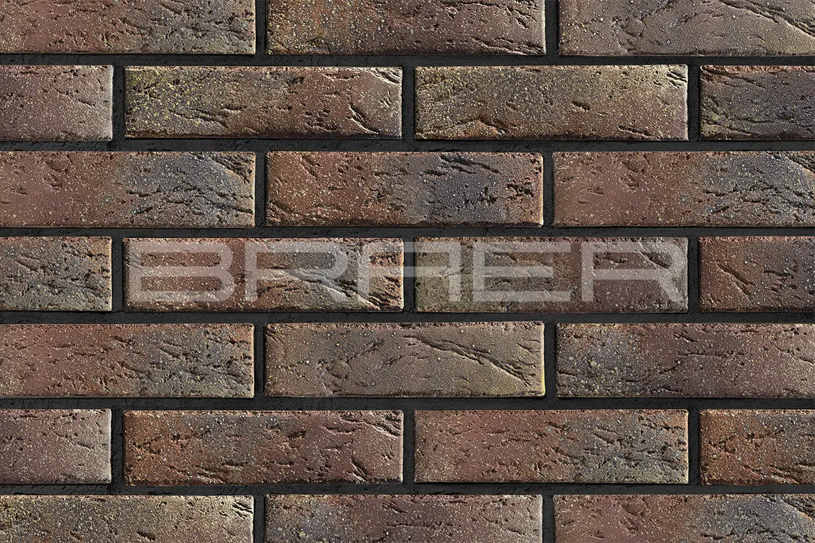 Эффект состаренного кирпича. Оттенки от коричнево-бордовых до графитовых с включениями песочного цвета. Поверхность визуально напоминает кирпич ручной формовки. Выпускается в формате 1НФ.