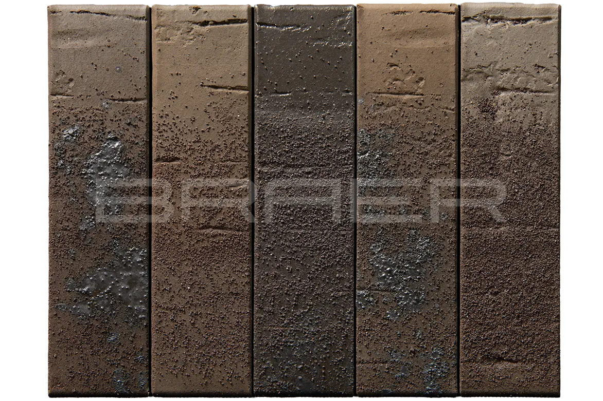 В его основе сочетаются различные оттенки коричневого, дополненные декоративным покрытием. Лицевые грани обрели совершенно новый визуальный эффект – имитация хаотично разлитого по поверхности металла. Неравномерное покрытие делает каждый кирпич непохожим на другой. А «вулканический» песок тёмно-бордового цвета оттеняет основную палитру кладки.