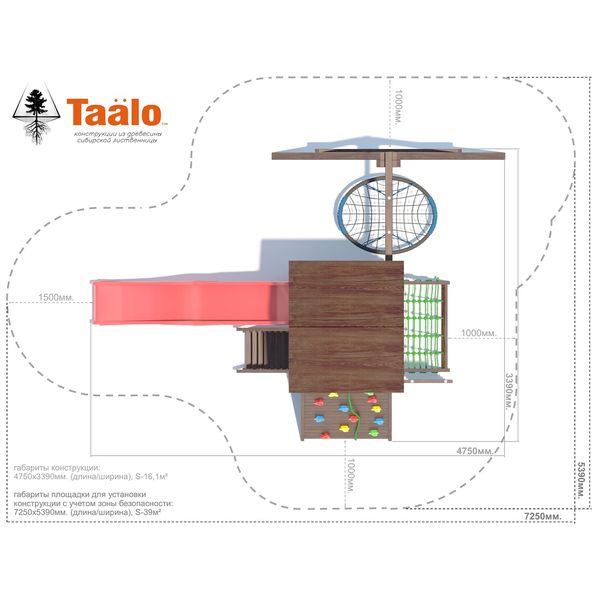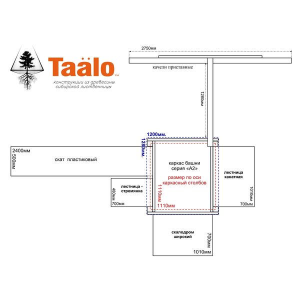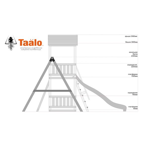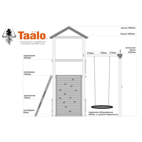 Максимальная высота от уровня поверхности игровой площадки до верхней отметки крыши 3360мм., высота каркаса основной башни 3000мм., высота игровых платформ 80 и1500мм. (к верхней платформе крепятся скат, лестницы и скалодром), высота ограждений платформы 700мм., качельная балка крепится на высоте 2350мм., балку для навесного оборудования возможно закрепить на высоте 2300-2900мм. Высота от уровня поверхности игровой площадки до уровня нижней части подвесного оборудования не ниже 400мм.