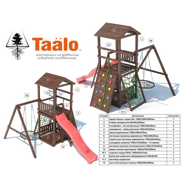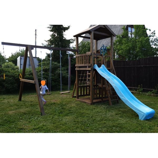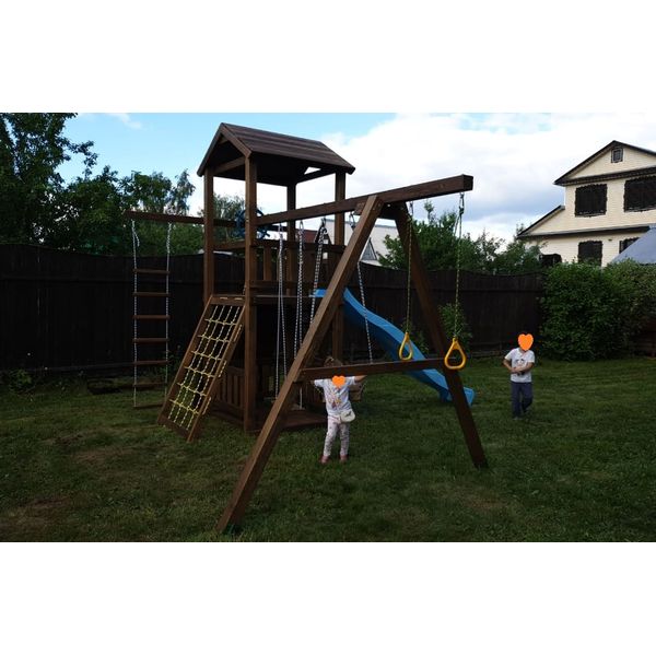 Основа конструкции – деревянная башня прямоугольной формы. В основании и на высоте 1,5м. в башню встроены игровые платформы с ограничителями и ограждениями, сверху башни двускатная деревянная крыша. К платформе приставлены пластиковый волнообразный скат с превосходной скользящей поверхностью, деревянная лестница-стремянка с перилами и широкий скалодромом и канатная лестница. К каркасному столбу башни прикреплены приставные качели и балка для навесного оборудования, на подвесах закреплены сидения качелей гнездо OVAL и подвесная лестница на канатах (возможно заменить