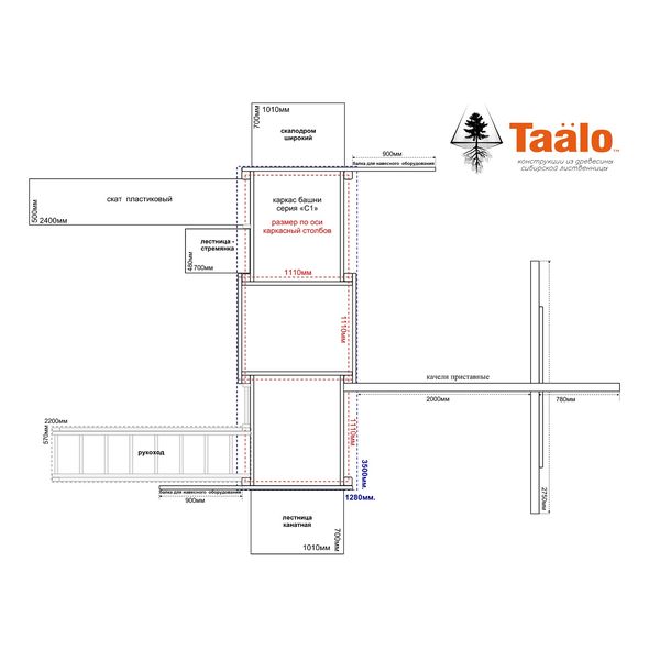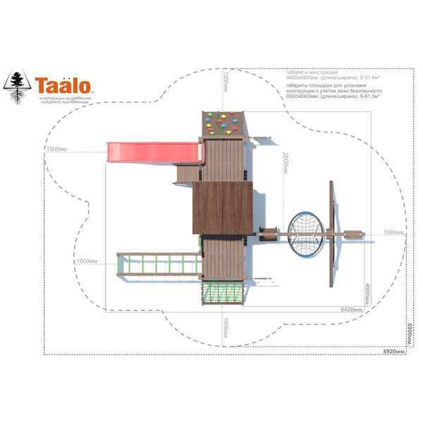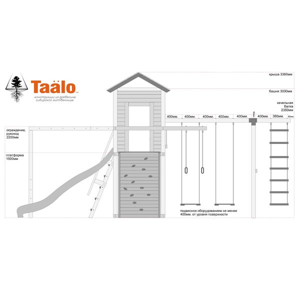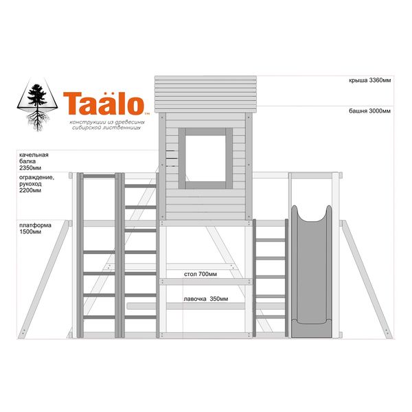 Максимальная высота от уровня поверхности игровой площадки до верхней отметки крыши 3360мм., высота каркаса основной башни 3000мм., высота каркаса балкона 2200мм., высота игровых платформ 80 и1500мм. (к верхней платформе крепятся скаты, лестницы и скалодром), высота ограждений платформы 700мм., высота стола 700мм., лавочек 350мм., высота рукохода и балок для навесного оборудования 2200мм., качельная балка крепится на высоте 2350мм. Высота от уровня поверхности игровой площадки до уровня нижней части подвесного оборудования не ниже 400мм.