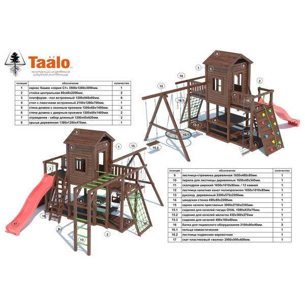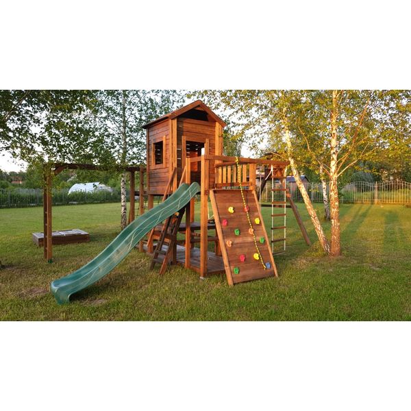 Основа конструкции – башня с двумя балконами. В основании конструкции и на высоте 1,5м. встроены игровые платформы с ограждениями и ограничителями. В нижней части конструкции расположен столик с лавочками, в верхней части башни встроен домик с двускатной деревянной крышей. К верхней платформе приставлены пластиковый волнообразный скат с превосходной скользящей поверхностью, деревянная лестница-стремянка с перилами, канатная лестница и широкий скалодромом. К каркасным столбам конструкции прикреплены шведская стенка, рукоход, балки для навесного оборудования и приставные качели, на подвесах качелей закреплены сидения качелей гнездо OVAL на канатах, сидение «малютка» на канатах и стандартное сидение на канатах, на балка для навесного оборудования закреплены гимнастические кольца на канатах и подвесная лестница на канатах