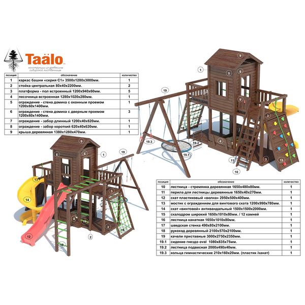Основа конструкции – башня с двумя балконами. В основании конструкции и на высоте 1,5м. встроены игровые платформы с ограждениями и ограничителями. В нижней части башни расположена песочница с крышкой «трансформер» – раскладывается в сидение со спинкой, в верхней части башни встроен домик с двускатной деревянной крышей. К верхней платформе приставлены пластиковый волнообразный скат с превосходной скользящей поверхностью, переходной мостик с пластиковым винтовым скатом, деревянная лестница-стремянка с перилами, канатная лестница и широкий скалодромом. К каркасным столбам конструкции прикреплены шведская стенка, рукоход и приставные качели, на подвесах качелей закреплены сидения качелей гнездо OVAL на канатах, гимнастические кольца на канатах и подвесная лестница на канатах