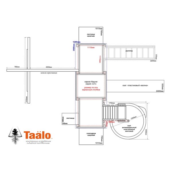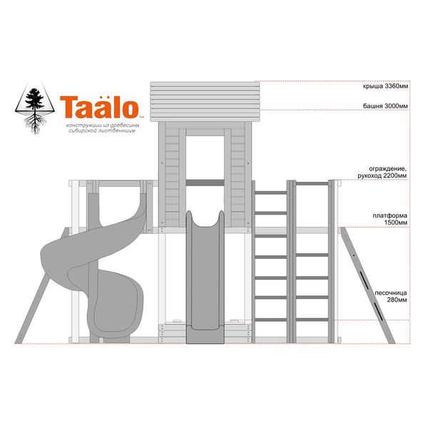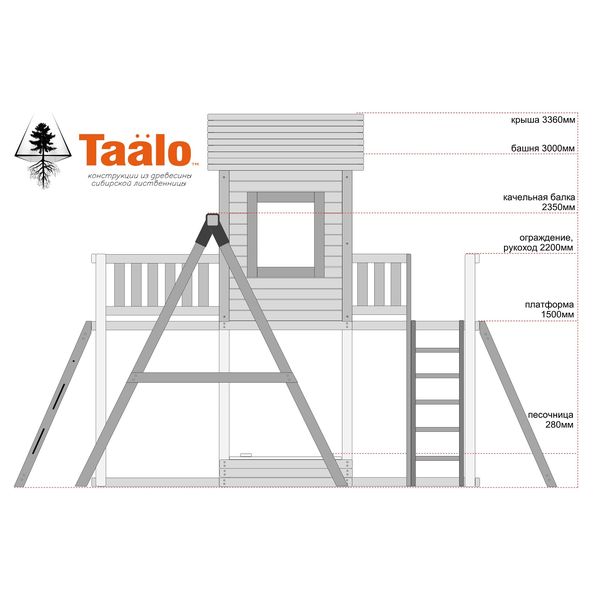 Максимальная высота от уровня поверхности игровой площадки до верхней отметки крыши 3360мм., высота каркаса основной башни 3000мм., высота каркаса балкона 2200мм., высота игровых платформ 80 и1500мм. (к верхней платформе крепятся скаты, лестницы и скалодром), высота ограждений платформы 700мм., высота песочницы 280мм., высота рукохода 2200мм., качельная балка крепится на высоте 2350мм. Высота от уровня поверхности игровой площадки до уровня нижней части подвесного оборудования не ниже 400мм.