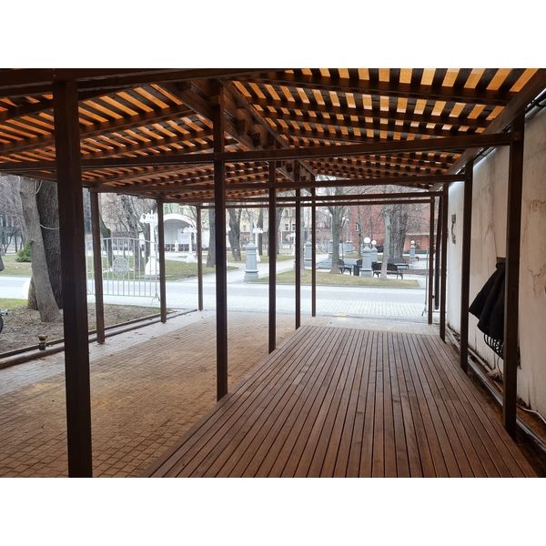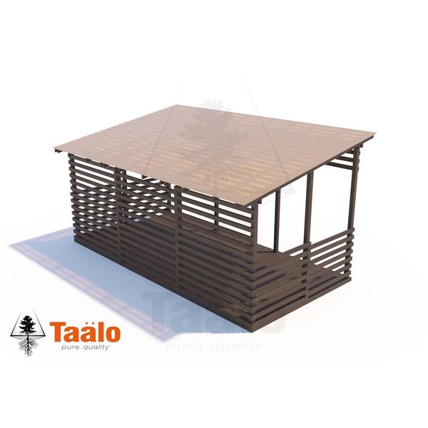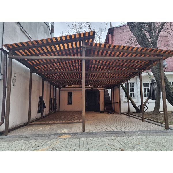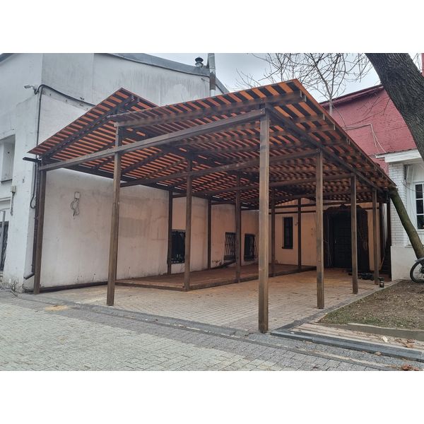 Описание. Каркасные стойки из бруса лиственницы сечением 90х90мм, связка стоек и боковые стенки из бруса лиственницы сечением 80х40мм. В основании конструкции встроена игровая платформа из бруса сечением 80х40мм. и доски лиственницы сечением 90х20мм., сверху башни под углом 10? крыша из бруса сечением 80х40мм., доски лиственницы сечением 90х20мм. и поликарбоната 6мм цвет «бронза». Деревянные комплектующие покрыты модифицированной масляной пропиткой цвета «орех», торцы столбов запечатаны мастикой. Теневой навес предназначен для круглогодичного пользования, элементы конструкции устойчивы к воздействию окружающей среды (влажность, перепады температур, грибок, насекомые).