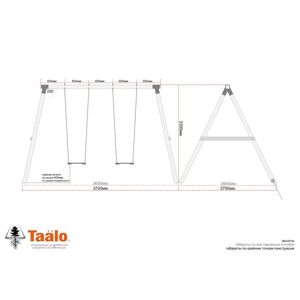 Максимальная высота от уровня поверхности игровой площадки до верхней отметки конструкции 2350мм. Высота от поверхности площадки до нижней части подвесного оборудования не ниже 400мм.
