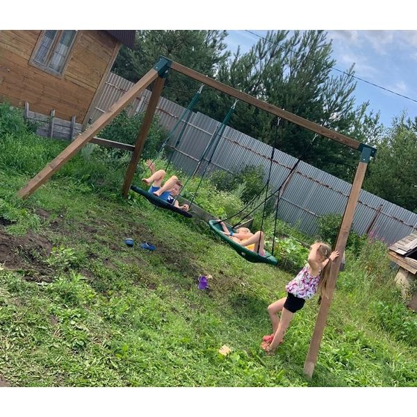 Основа конструкции – каркас качели. Конструкция оснащена подвесами тип «О», стандартными деревянными сидениями для качелей на канатах, арматурными анкерами. Возможно заменить сидения стандартные на сидение «гнездо», со спинкой и подлокотниками, «TRIX 3 в 1» или «малютка».