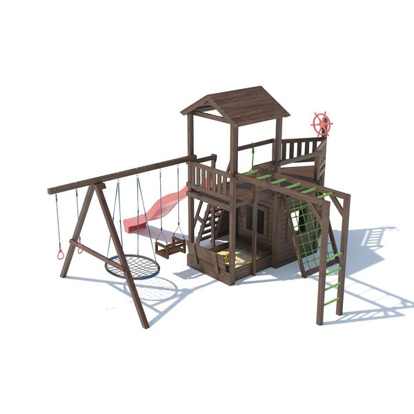 Каждая деревянная деталь состоит из древесины сибирской лиственницы, камерная сушка, влажность 8-12%. Обработка безопасным для детей покрытием в два слоя – восковой лазурью «ADLER» цвет «орех», со стороны торцов дополнительно запечатана мастикой. При желании, вы сможете самостоятельно обновлять покрытие деревянных элементов конструкции (при естественном износе покрытия, один раз в 3-5 лет) или проводить реставрацию отдельных конструктивных элементов (при механическом повреждении), главное подобрать по цвету восковую лазурь или масло на водорастворимой основе, предназначенной для эксплуатации на улице.