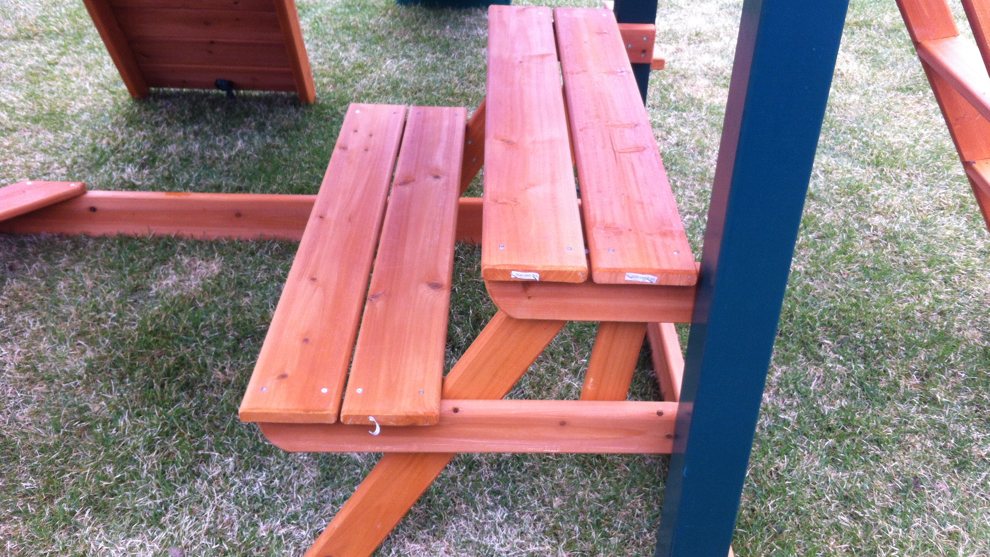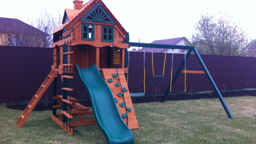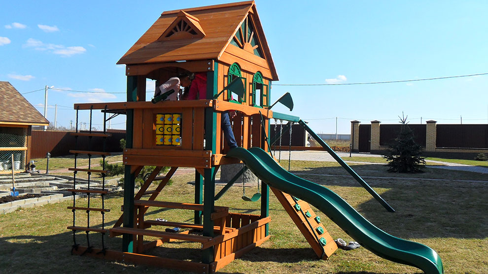 В комплектацию площадки входит все, что нужно малышам для качественного времяпровождения: скалодром и веревочная лестница, где они могут проверить свою ловкость и сноровку, пластиковый спуск с волной, столик, отлично подходящий для рисования или спокойных игр.
