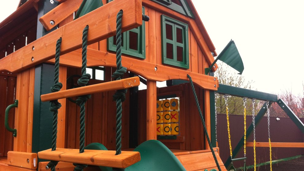 Спортивно-игровой комплекс GORILLA (PLAYNATION) «Солнечный луч» с большим деревянным фортом оснащен рулем, телескопом и перископом, флажками и колокольчиком. Дерево, из которого изготовлен детский городок, пропитано специальным составом, защищающим от гниения, солнечных лучей и насекомых.