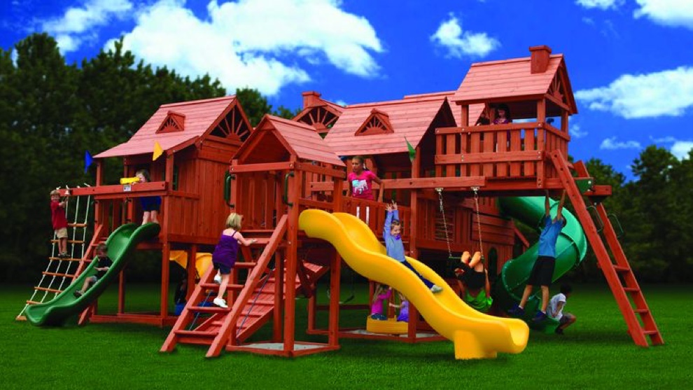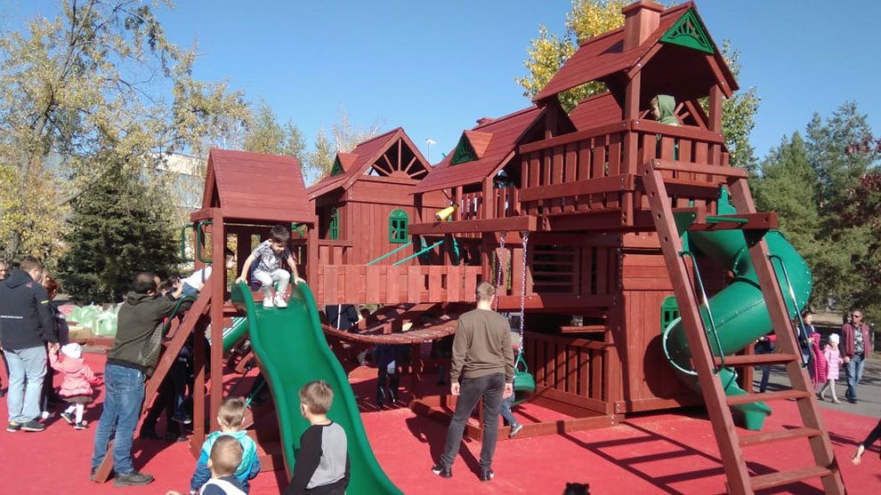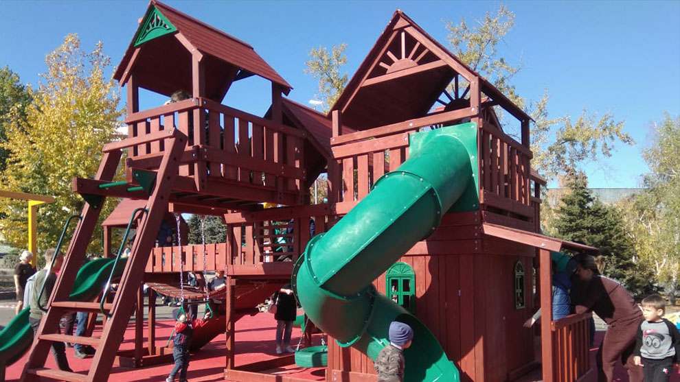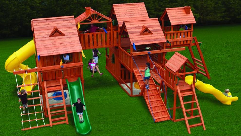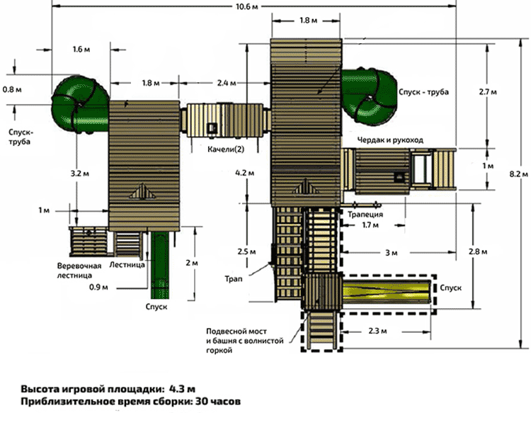 В комплектацию входит: семь различных игровых зон на разных уровнях общей площадью более 19 м2, два встроенных домика с окошками, крыльцом и дверьми, четыре суперпрочные горки различной конструкции, три песочницы и многое другое. Эксклюзивная конструкция мостика соединяет зоны верхнего уровня, а с верхней галереи открывается неповторимый вид.