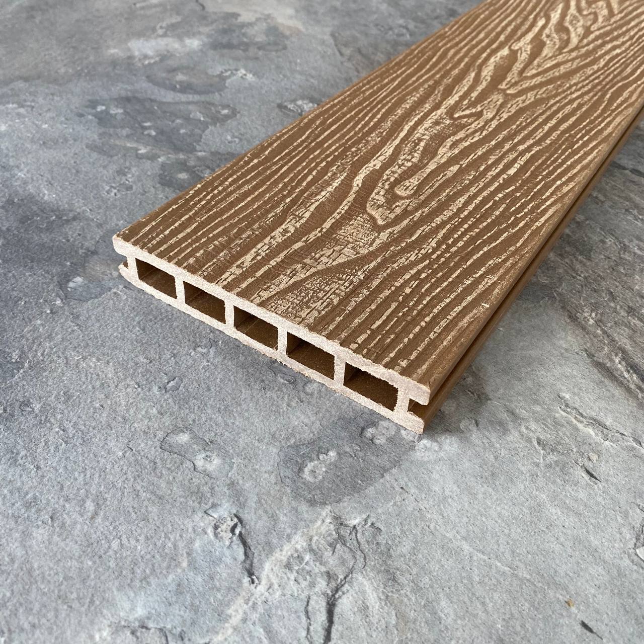 Пустотелая террасная доска из ДПК Latitudo 3D-Wood имеет две разные глубокие древесные текстуры на поверхностях. Выпускается в четырех цветах, длиной 3 и 4 метра.