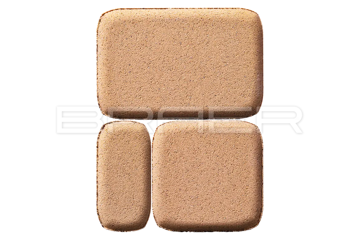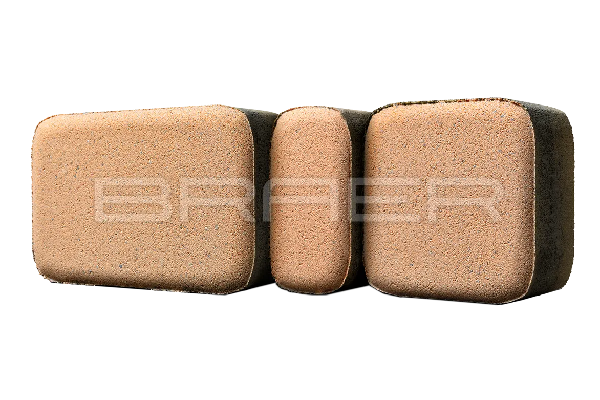 Тротуарная плитка BRAER состоит из 2 слоев: основного и лицевого. Технология двойного вибропрессования позволяет поэтапно уплотнить слои, что увеличивает прочность продукции. Основной слой содержит высокопрочный цемент и гранитный щебень, а лицевой (10% толщины) – мелкофракционный песок, белый цемент и пигменты.