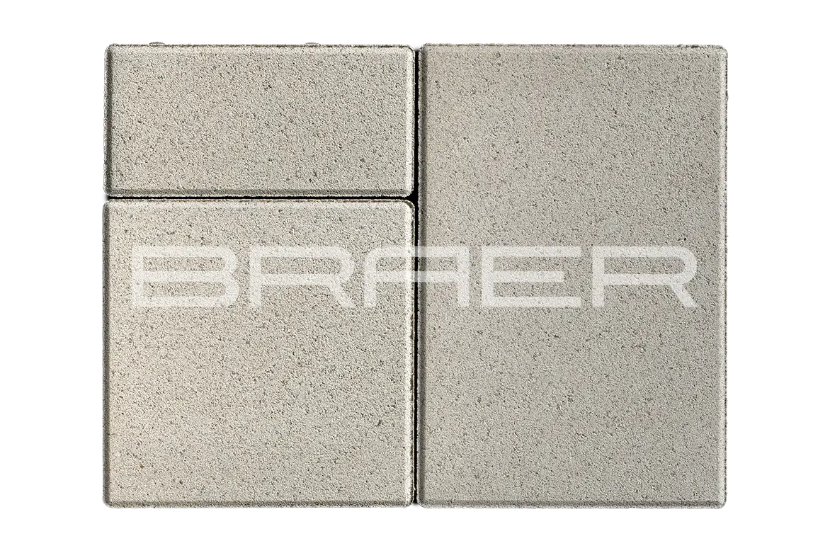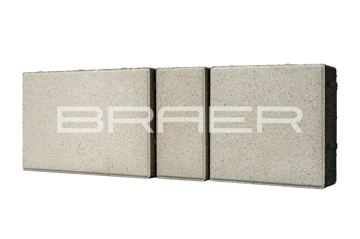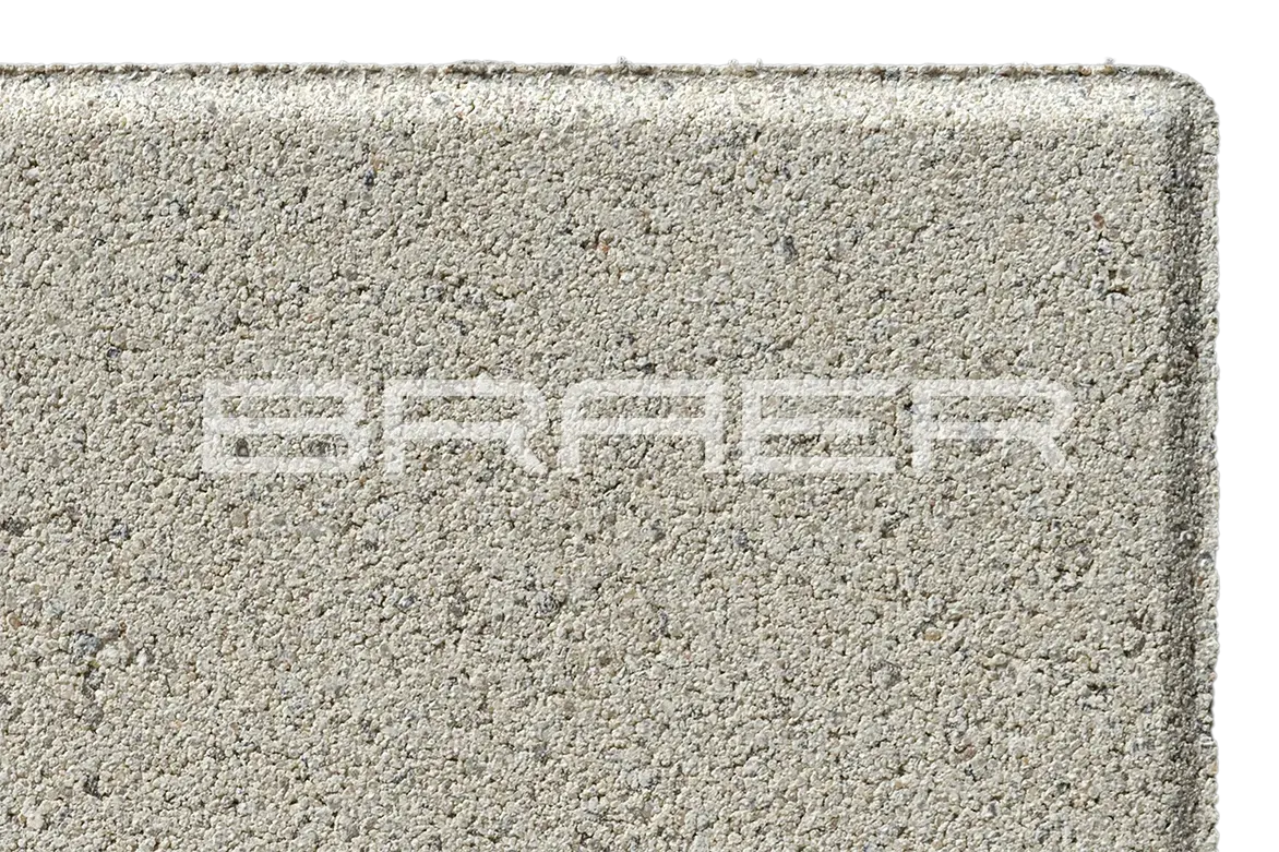 Тротуарная плитка BRAER состоит из 2 слоев: основного и лицевого. Технология двойного вибропрессования позволяет поэтапно уплотнить слои, что увеличивает прочность продукции. Основной слой содержит высокопрочный цемент и гранитный щебень, а лицевой (10% толщины) – мелкофракционный песок, белый цемент и пигменты.