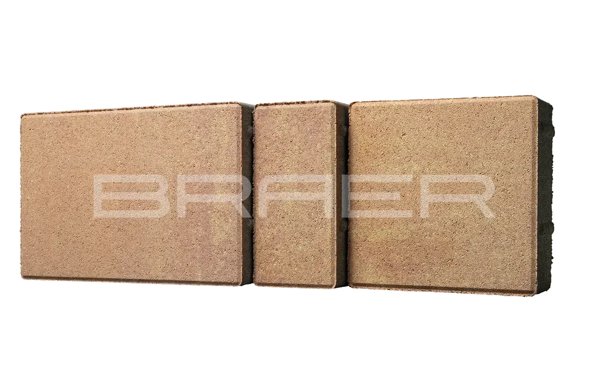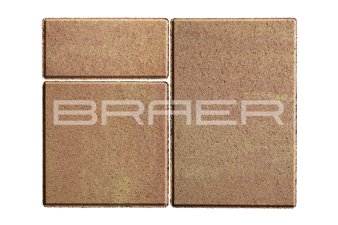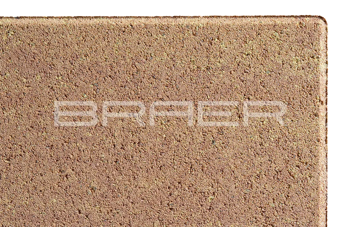 Тротуарная плитка BRAER состоит из 2 слоев: основного и лицевого. Технология двойного вибропрессования позволяет поэтапно уплотнить слои, что увеличивает прочность продукции. Основной слой содержит высокопрочный цемент и гранитный щебень, а лицевой (10% толщины) – мелкофракционный песок, белый цемент и пигменты.