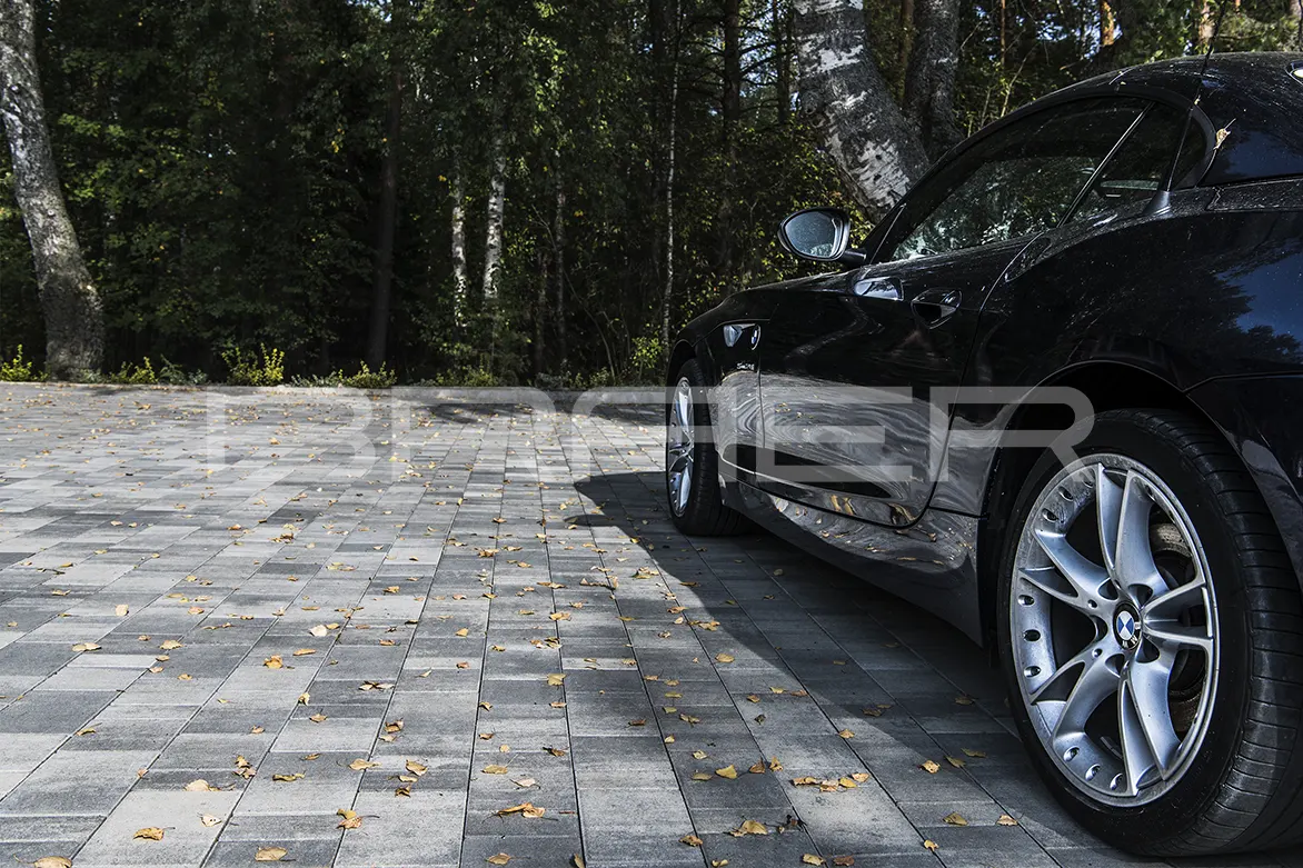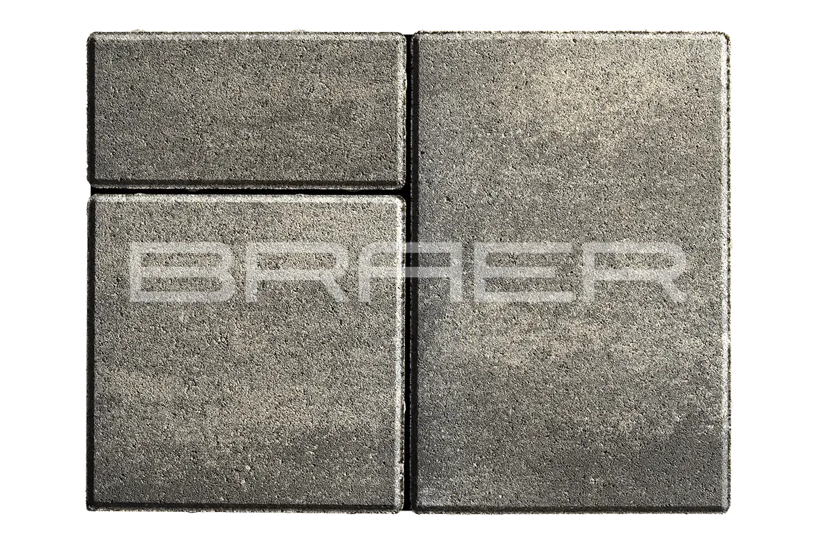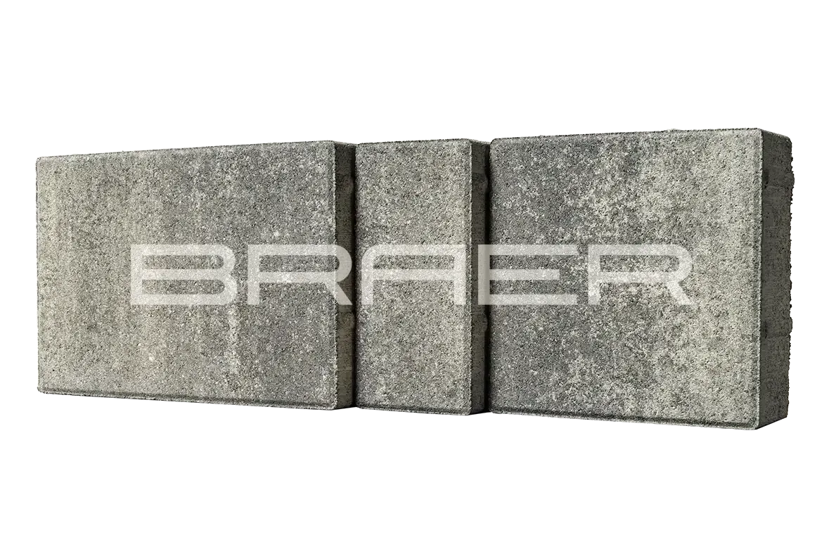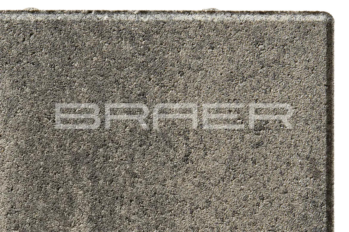 Тротуарная плитка BRAER состоит из 2 слоев: основного и лицевого. Технология двойного вибропрессования позволяет поэтапно уплотнить слои, что увеличивает прочность продукции. Основной слой содержит высокопрочный цемент и гранитный щебень, а лицевой (10% толщины) – мелкофракционный песок, белый цемент и пигменты.