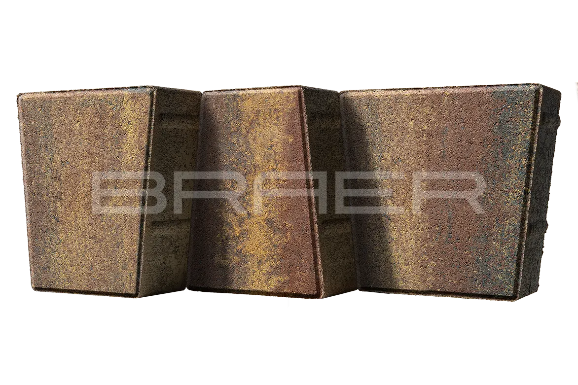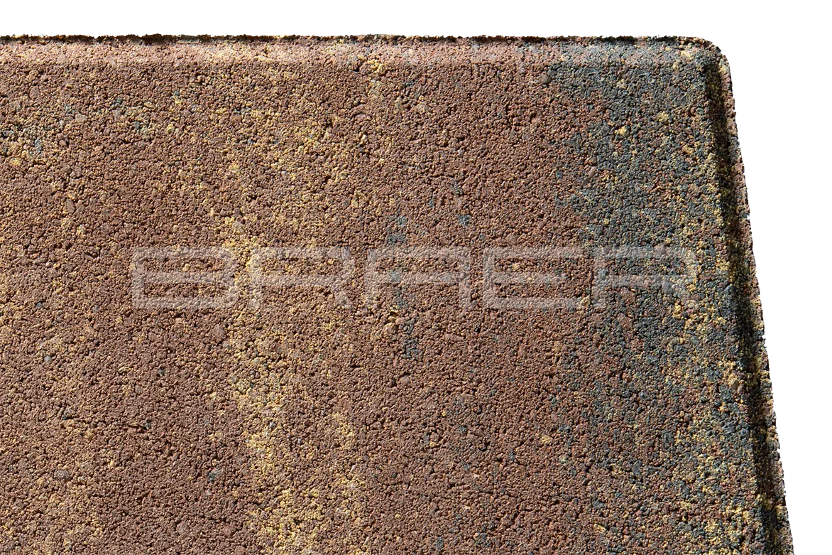 Тротуарная плитка BRAER состоит из 2 слоев: основного и лицевого. Технология двойного вибропрессования позволяет поэтапно уплотнить слои, что увеличивает прочность продукции. Основной слой содержит высокопрочный цемент и гранитный щебень, а лицевой (10% толщины) – мелкофракционный песок, белый цемент и пигменты.