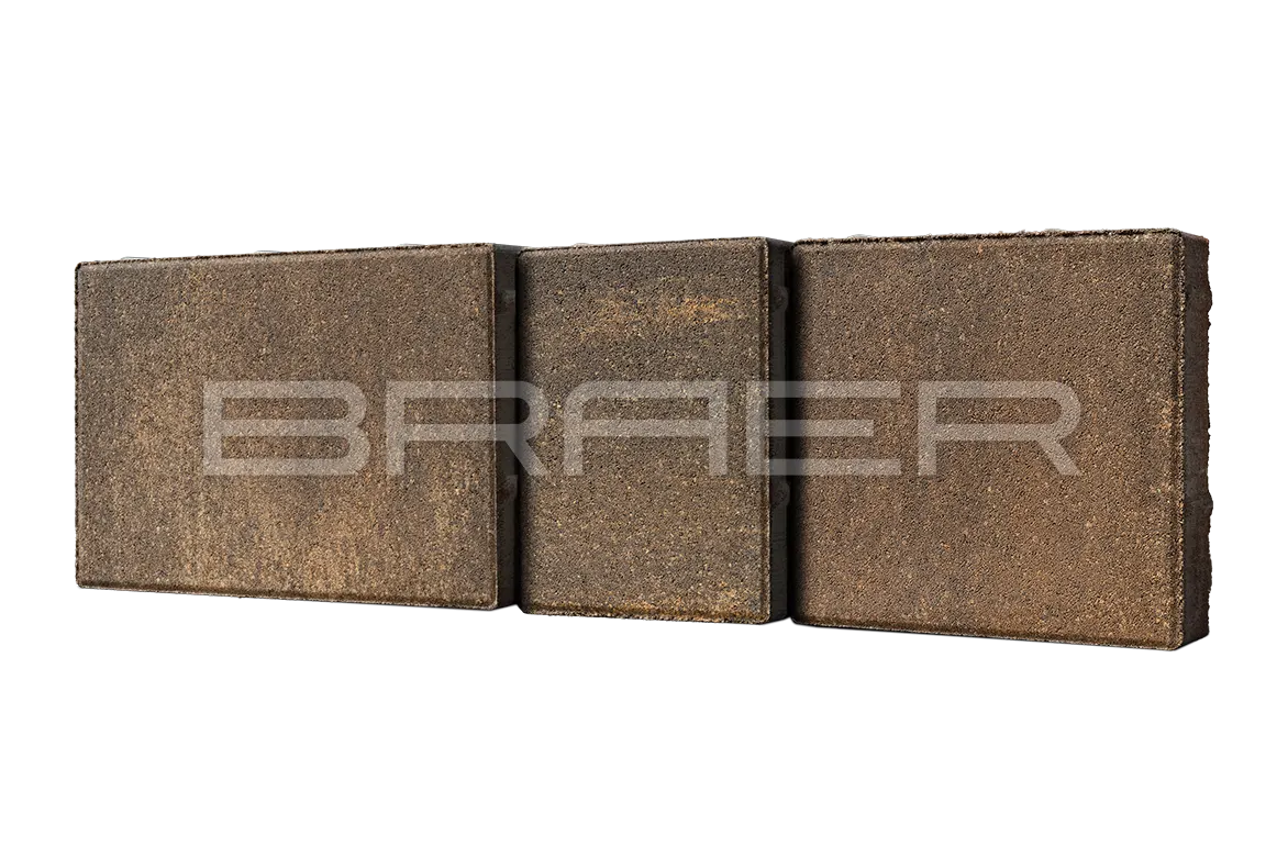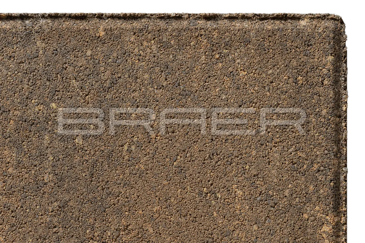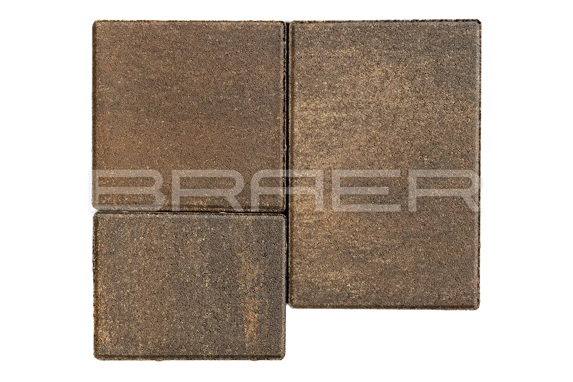Тротуарная плитка BRAER состоит из 2 слоев: основного и лицевого. Технология двойного вибропрессования позволяет поэтапно уплотнить слои, что увеличивает прочность продукции. Основной слой содержит высокопрочный цемент и гранитный щебень, а лицевой (10% толщины) – мелкофракционный песок, белый цемент и пигменты.